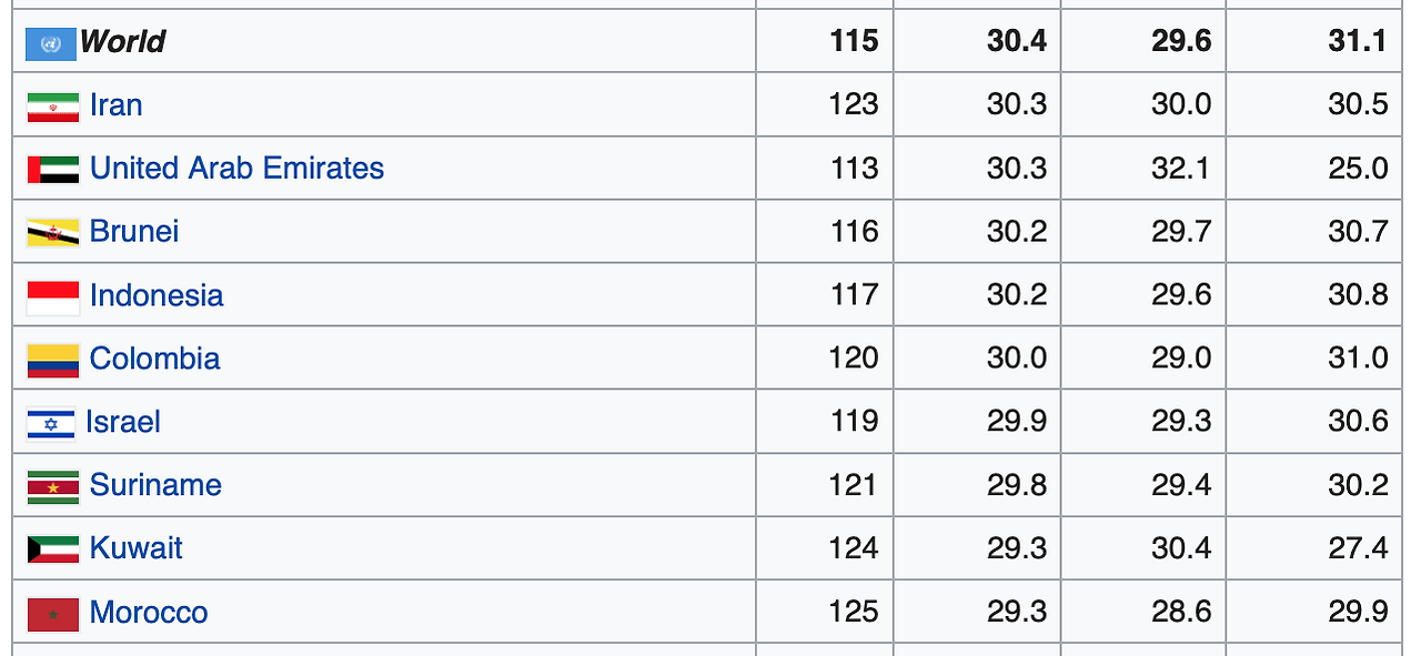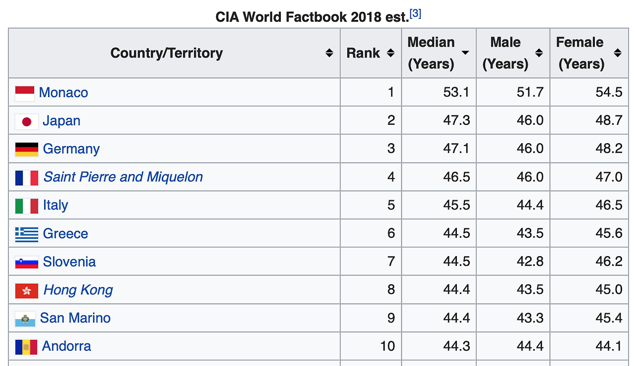 인도네시아 국민의 평균 연령과 평균 수명 등을 살펴보기에 앞서, 비교를 위해 전 세계 인구 현황을 잠시 살펴보자. 세계에서 평균 연령이 가장 높은 나라는 모나코다. 그레이스 켈리가 시집간 지중해의 보석 같은 나라. 평균 연령이 다른 나라들보다 월등히 높은 53살로 1위를 달리고 있는 점이 눈에 띈다. 평균 연령이 53살이면 길거리에 돌아다니는 사람 대부분이 할아버지 할머니인 셈이다.