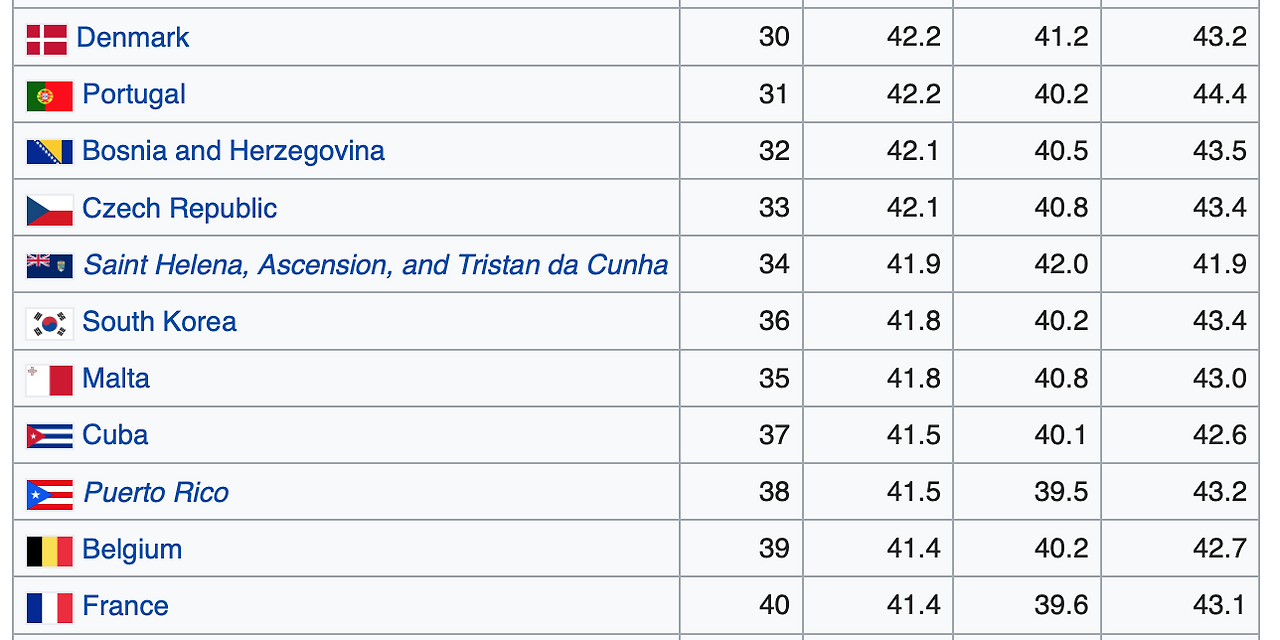 세계 최장수 국가 일본은 평균 연령이 높은 국가 2위에 랭크되어 있고, 노령화가 급격히 진행되고 있는 우리나라는 36위다. 우리나라는 현재 노령화도 문제지만 출산율이 너무 낮아서, 국민의 평균 연령이 급격히 오르고 있다. 수년 안에 평균 연령이 높은 국가 10위권 내로 진입할 것으로 보인다. 평균 연령이 높은 것은 그 나라의 장기적인 경제 성장세에 악영향을 끼친다. 경제활동 인구는 줄어들고, 부양해야 할 노인들이 늘어나기 때문이다. 연금 고갈 등의 문제도 있을 것이다.