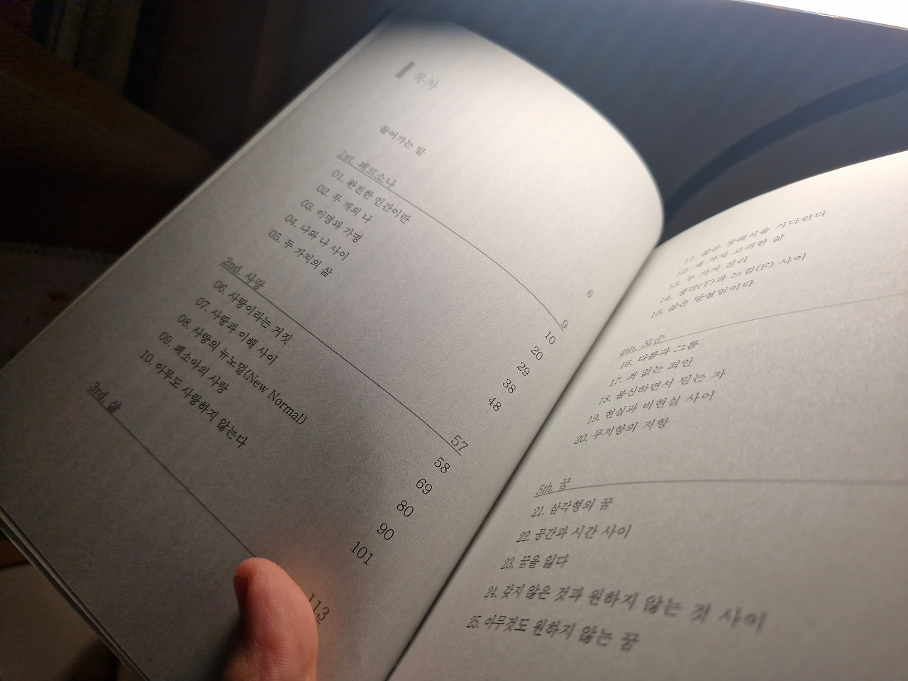 “현실적인 삶과 이상적인 삶은 서로 다른 것을 요구한다. 둘은 각자의 삶의 양식이 있다. 절대로 같은 방식으로 두 가지의 삶을 영위할 수 없다. 이건 마치 양자물리와 고전 물리의 세계와 같다.” -53p -