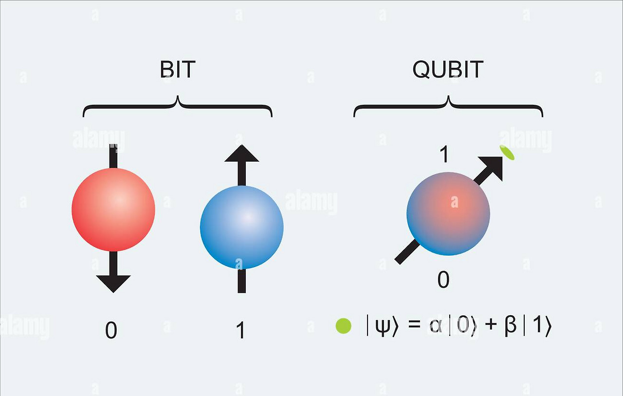 “고전 컴퓨터에서 비트(bit)라고 부르는 이진수 한자리를 양자컴퓨터에서는 퀀텀 비트(Quantum bit)라는 뜻에서 ‘큐빗(Qubit)’이라고 부른다. 비트와 큐빗의 차이라면, 비트는 0과 1돌 중 하나의 값만 가지지만 큐빗은 0과 1뿐 아니라 둘의 어떤 중첩 상태도 될 수 있다.” [3부 11장]