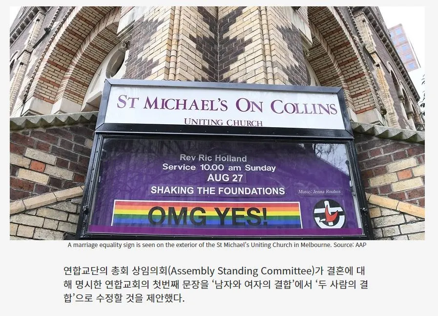 하지만 종교는 시대가 변해도 변하지 않는 믿음과 가치가 담겨있기 때문에 오랜 시간을 거슬러 인간들의 정신을 지배할 수 있었다. 그런 종교에 변화의 바람이 불고 있는 것일까? 호주의 대표 기독교 교단인 <Uniting Church>가 실질적으로 이런 동성애를 포용하는 방향으로 정책을 바꾸었다. 물론 모든 신도들의 뜻이 반영된 것은 아닐것이며 교회 상위 지도층들의 판단일 가능성이 크다. 성경에서 죄악으로 명기하는 동성애를 인정한다는 것은 경전에서 벗어난 신앙으로의 변화를 의미한다.