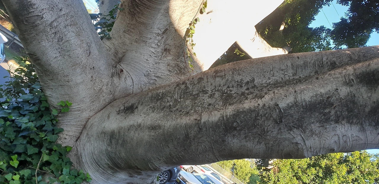 아마 수만 년의 시간을 견디며 이곳을 지켜왔을 것이다. 마치 콘크리트 회색의 줄기와 가지를 가진 유칼립투스 나무이다. 그 줄기는 어찌나 굵은지 성인 세네 명은 둘러싸야 감쌀 수 있을 정도로 두껍다. 높이도 30m는 훌쩍 넘어 보인다. 그가 내어주는 그늘 덕에 내차는 호주의 강렬한 태양을 피할 수 있다. 그 옆을 지날 때면 거대한 몸집에서 오랜 세월의 기운 같은 것이 느껴진다. 나무 전체를 카메라에 담으려면 한참을 떨어져야 가까스로 앵글 안에 다 집어넣을 수 있다. 나무랑 같이 찍고 싶어 멀리 카메라를 세워두고 달려와서 찍힌 사진 속에 나는 마치 [월리를 찾아서]에 나오는 월리처럼 누군지 알아볼 수 없을 만큼 콩알만 하게 나온다. 나무 가지들도 웬만한 나무줄기 보다도 굵다. 가까이서 보면 마치 영화 속에서 본 그 옛날 거대한 공룡들의 근육과 피부조직 같아 보이기도 하다. 거대한 나무줄기 곳곳에는 누군지 모르지만 날카로운 무언가로 아무개 ♡ 아무개의 사랑을 새겨놓거나 누굴 비방하는 듯한 욕 같은 것도 적혀있다. 참 어딜 가나 인간은 지워지지 않을 자신의 추억을 남기려 한다. 나무는 지울 수 없는 상처를 남긴다.