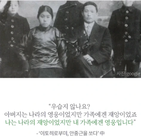 얼마 전에 본 <이토 히로부미, 안중근을 쏘다> 보았다. 우리가 알고 있는 국가의 영웅인 안중근 의사는 나라의 은인이고 정의의 수호자이다. 그러나 그가 가족도 지키지 못한 못난 아비였다는 사실을 아는가? 독립투사의 아내로 자식으로 살아가는 것은 그들에게는 지옥이었다. 그의 장남은 이유 없이 독살을 당하고 둘째인 안준생은 일제의 계속되는 협박 속에 가족의 안위를 위해 이토 히로부미의 아들에게 공개 사죄한다. 사람들은 호부견자(虎父犬子)라며 그를 욕하며 나라를 팔고 아버지의 명예에 똥칠을 했다며 손가락질했다. 과연 아버지의 명예를 위해 가족들의 삶이 망가져도 괜찮다고 누가 감히 얘기할 수 있겠는가? 안중근 의사는 국가의 영웅이었는지 모르지만 가족들에겐 재앙이었다. 우리는 영웅들의 위대한 모습에만 관심을 가질 뿐이다. 그 뒤에 이름 없는 희생에는 관심을 가지지 않게 마련이다. 나의 가족이 볼모로 잡혀 있어도 당신은 위인이 되고 싶은가? 내 국민과 가족의 의식주(생계)보다 세계평화수호, 자유공정무역, 지구환경보전이 더 중요한가?