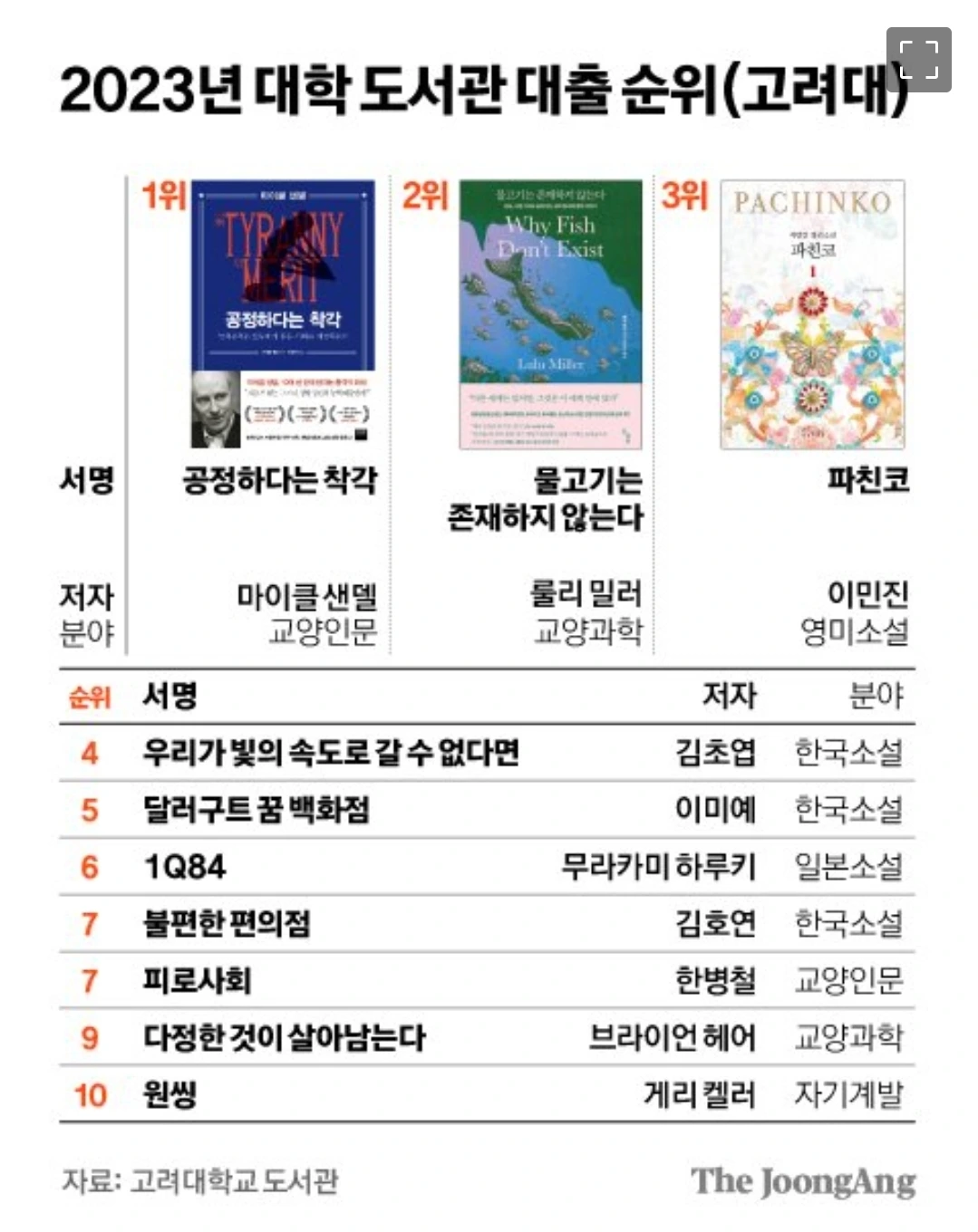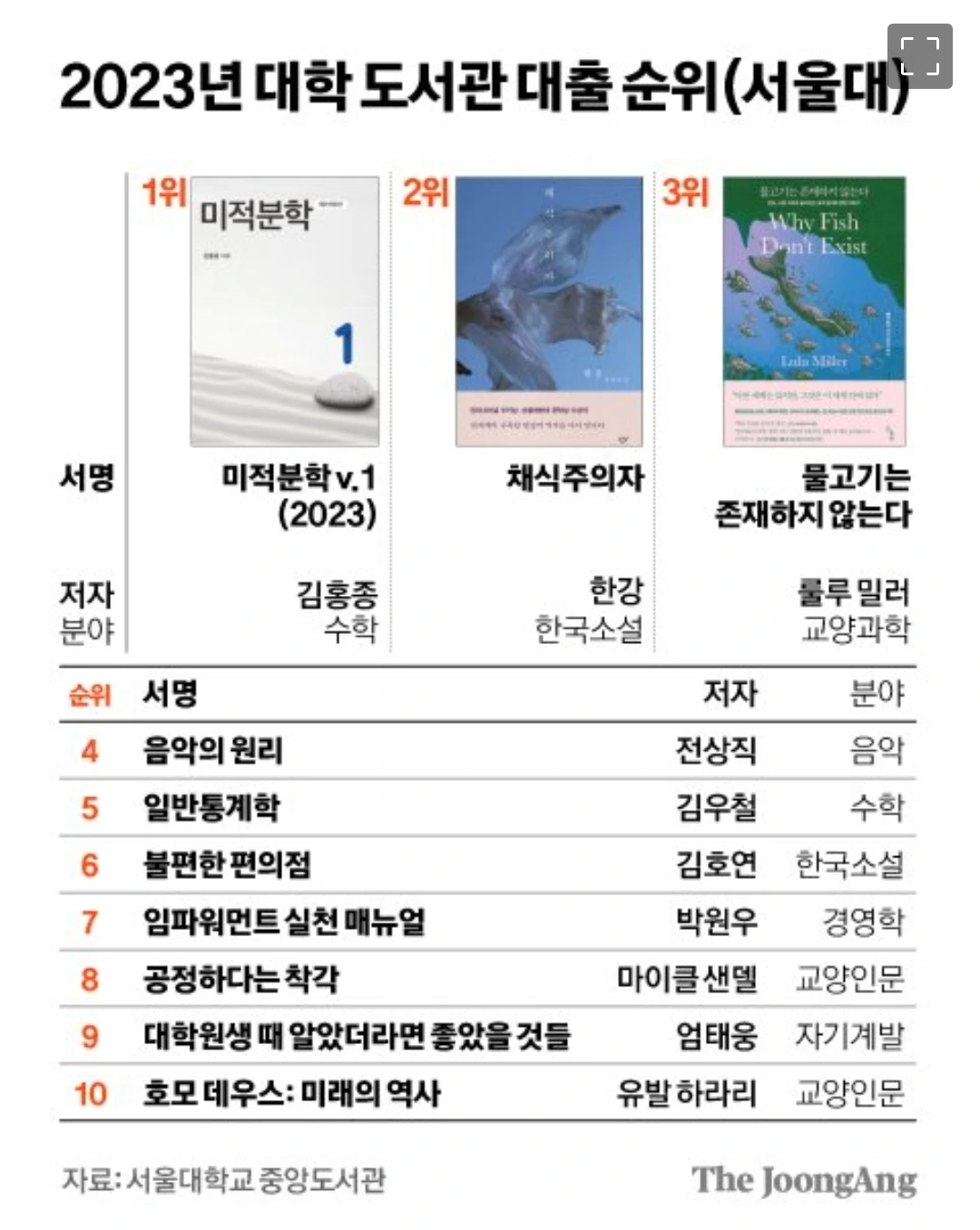 보통 집을 나서면 4시 반이 좀 넘어간다. 요즘 일하는 곳이 꽤나 멀어 차 안에서 보내는 시간이 길다. 오늘은 무슨 책을 읽을까? 아니 들을까? 최근에 읽어왔던 페소아의 [불안의 서]의 여운이 오래간다. 그 여운을 이어갈 만한 책을 찾다가 우연히 보게 된 SKY (서울대, 연세대, 고려대) 도서관 책 대여 순위라는 짧은 기사 글을 보게 되었다. 세 대학교에서 공통적으로 많이 대여되는 책이 있다.