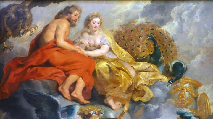제우스와 헤라는 세속의 타락한 부부의 모습을 닮아있습니다. 뛰어난 능력(부)을 권력을 지닌 제우스는 끊임없이 밖으로 돌며 여자를 꼬시고 품으며 바람을 피우고 다닙니다. 결국 21명의 부인과 43명의 자녀를 가집니다. 영웅호색이란 말이 틀리지 않습니다. 우월한 남성은 더 많은 유전자를 더 많이 퍼뜨리려 합니다. 그런 제우스를 못마땅하게 생각하는 헤라는 끈질기게 그를 행적을 쫓으며 그와 관계를 맺은 여자들과 배다른 자식들을 핍박하고 제거하려는 모습을 보입니다. 그럼에도 불구하고 남편을 벌하지는 못합니다. 헤라는 제우스의 일곱 번째 부인이지만 정실부인으로 가장 많은 힘과 권위를 지닌 여신입니다. 제우스도 헤라 앞에서는 쩔쩔매는 모습을 보입니다.