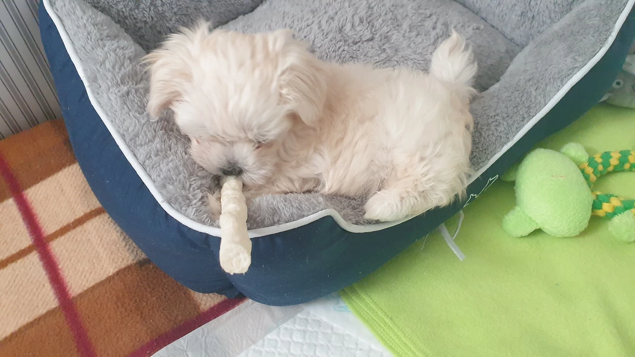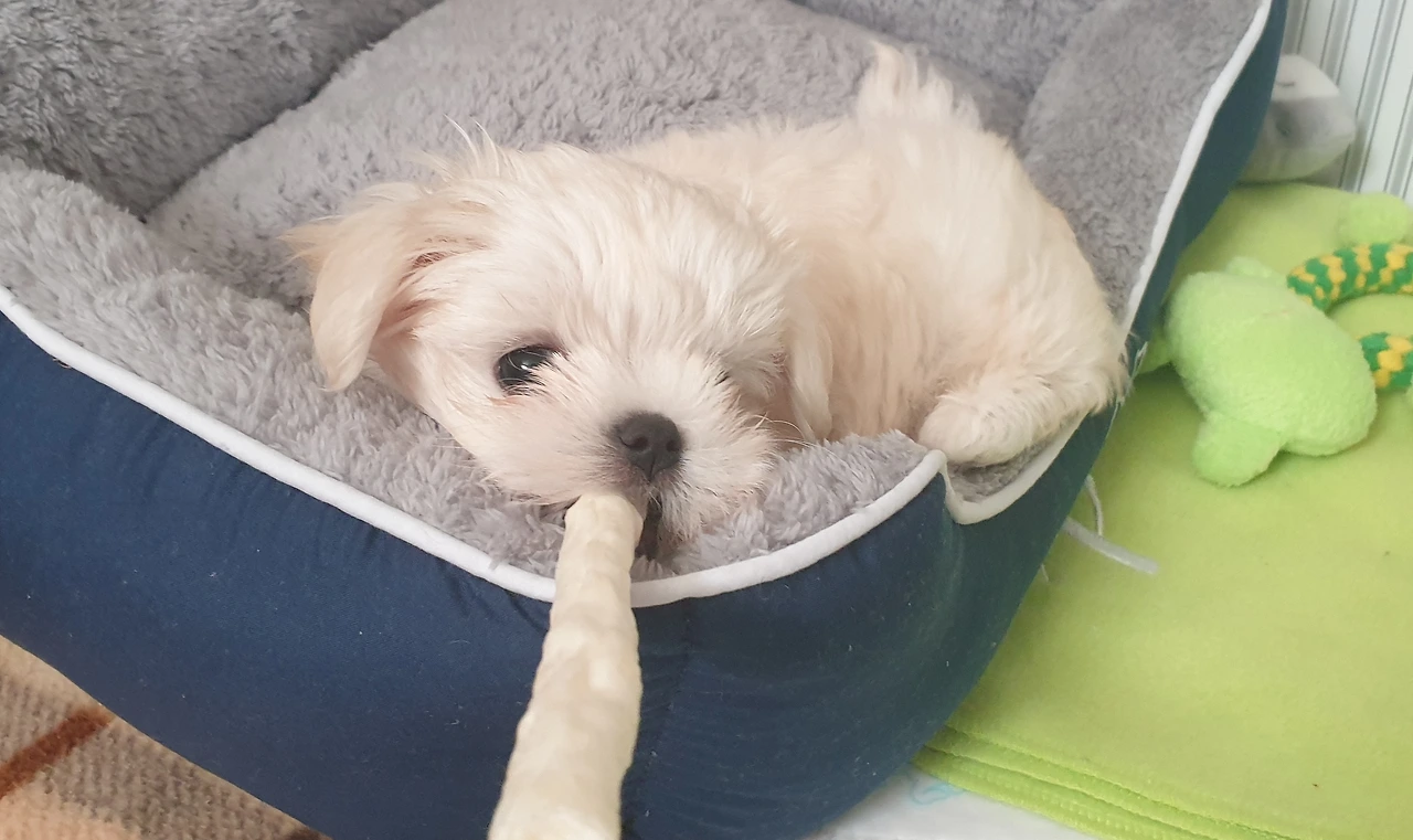 그중 고민이 많았던 점 하나는 두리가 만 3개월이 넘었던 무렵, 유치가 어느 정도 나기 시작한 시기였다. 임시로 세워둔 벽이나 플라스틱으로 된 방울 공 장난감을 계속 갉아먹듯 깨무는 것이었다. 이가 슬슬 날 시기인 것은 알았고 원래 보호하던 곳에서도 자주 씹으려고 했다고 듣긴 했었다. 그래도 플라스틱을 씹는 건 원치 않아서 그렇게 잘 가지고 놀던 장난감을 치우고, 최대한 천으로 된 재질의 담요, 인형을 주변에 놔줬다. 이가 날 때 개껌을 많이 준다고는 하는데, 아무리 봐도 두리는 너무 아기여서 개껌을 줘도 괜찮을지 고민이었다. 개월 수만 보면 급여를 시작해도 될 시기였지만... 이때의 우리 가족은 조심성이 정말 많았다. 물론 개껌마다 급여 시기가 적혀 있긴 하지만, 이왕이면 더 안전한 조건임을 확인한 뒤에 주고 싶었다. 역시 전문가에게 상담을 하고 급여해보자고 생각했다.