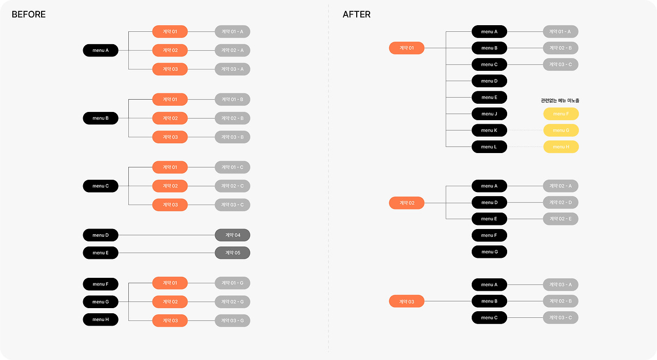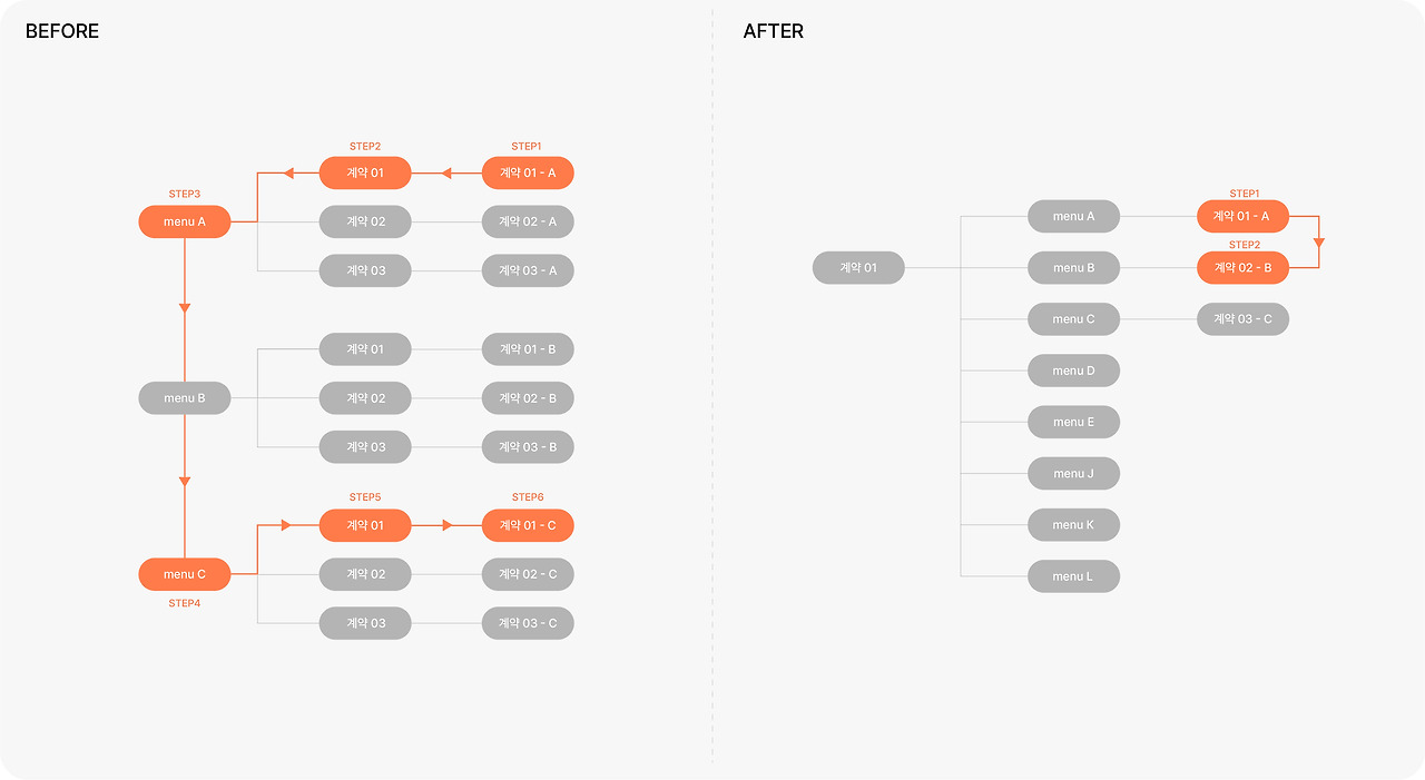 여러 데이터 분석 끝에 사용자는 ‘나’의 계약 정보를 확인/관리하고, 보험료를 쉽고 한 번에 보기 원한다는 결과를 도출했어요. 처음에는 중복되는 메뉴를 없애고, 가장 많이 찾는 메뉴 위치를 재배치하면 될 거라고 가볍게 생각했는데 아니었던 거죠.