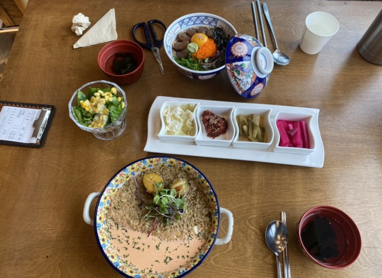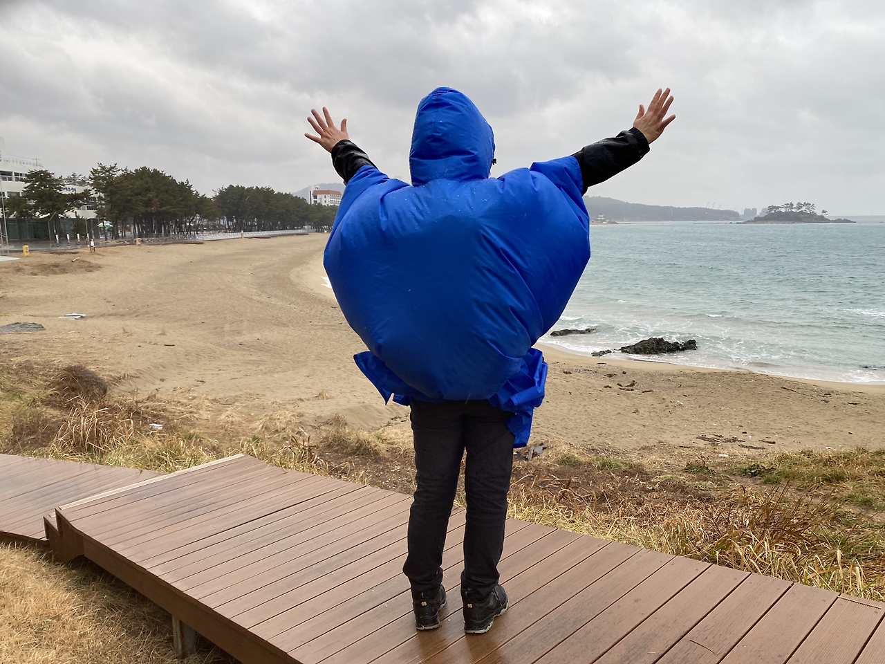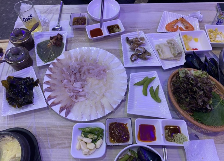 진하해변을 따라 난 산책로에는 기울어진 가지에 노란색 까만색을 섞어서 머리조심이라고 크게 써붙인 안내문을 둘둘 감아둔 나무가 여러 그루 있었다. 조심하며 걸었는데도 얼굴에 들이치는 비를 피하려고 고개를 숙이고 걷다가 소나무에 머리를 박기도 했다. 3시 30분쯤, 드디어 4코스 종점인 진하해변에 도착했다. 종점 스탬프가 있는 가까운 곳의 낡아 보이는 숙소를 잡을 것인가 몇십 미터 떨어진 깔끔한 곳으로 갈 것인가 고민하다 조금 더 걸어가서 숙소를 잡기로 했다. 나는 그만 걷고 싶어서 발걸음이 멈춘 그곳에서 제일 가까운 곳으로 정하자고 말하고도 싶었으나 k의 말을 따랐다. 첫날 해운대에서 묵었던 숙소와 같은 이름이었고 가격은 만원이 더 비쌌다. 저녁 식사 메뉴는 모둠회로 정했다.