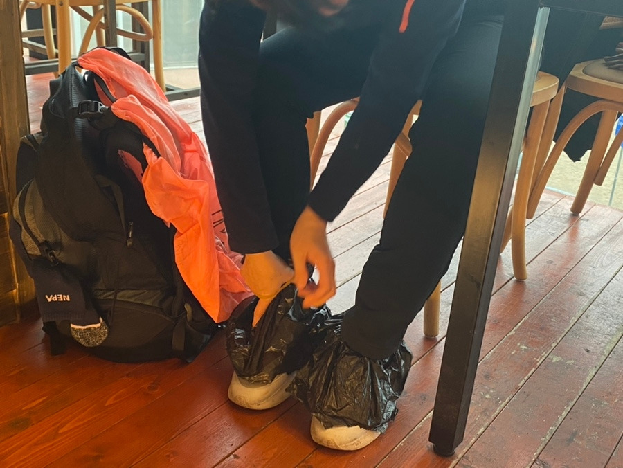 신암리 바닷가 쪽으로 나올수록 빗줄기가 점점 굵어지고 바람까지 불기 시작했다. 비옷 만으로는 감당이 안되어 우산까지 쓰고 걸었다. 해파랑길을 며칠 걸으며 알 게 된 것 중 한 가지. 기운이 넘치는 오전에 조금 빨리 걸어서 이만보를 채우고 점심 식사 후 만보 정도를 걸으면 코스의 종점이 가까워진다는 것이다. 오전에 조금이라도 더 걸어서 간절곶 가까운 곳까지 가서 점심을 먹자는데 의견 일치를 보고 나사리 바닷가까지 가서 전복밥과 새우장 덮밥을 먹었다. 식사 후 k는 식당에서 빌린 가위로 뚝딱뚝딱 조물딱조물딱 하더니 까만 비닐봉지와 고무밴드를 이용해서 운동화에 멋진 우의를 만들어 입혀줬다.