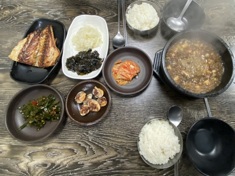 덕하시장 어귀 이통일반 식당에서 7,000원짜리 된장찌개백반을 먹고 나와서 바로 옆 분식가게에 가서 순대도 한 접시 먹었다. 떡볶이와 어묵도 먹음직스러워 보였지만 배가 불러서 2,000원짜리 쌈장 찍어 먹는 순대만 맛을 봤다. 둘 다 예매한 차표 시간까지 여유가 있어서 덕하시장이 내려다 보이는 카페에 갔다. 어제밤에 예매한 표 중에서 뒷 시간 표를 예매 취소하고 쉬었다. 따뜻한 레몬차를 마시고 눈을 감고 있으니 온몸이 노곤해졌다. 고개를 앞으로 꺾었다 뒤로 꺾었다 하며 편안하게 졸았다.