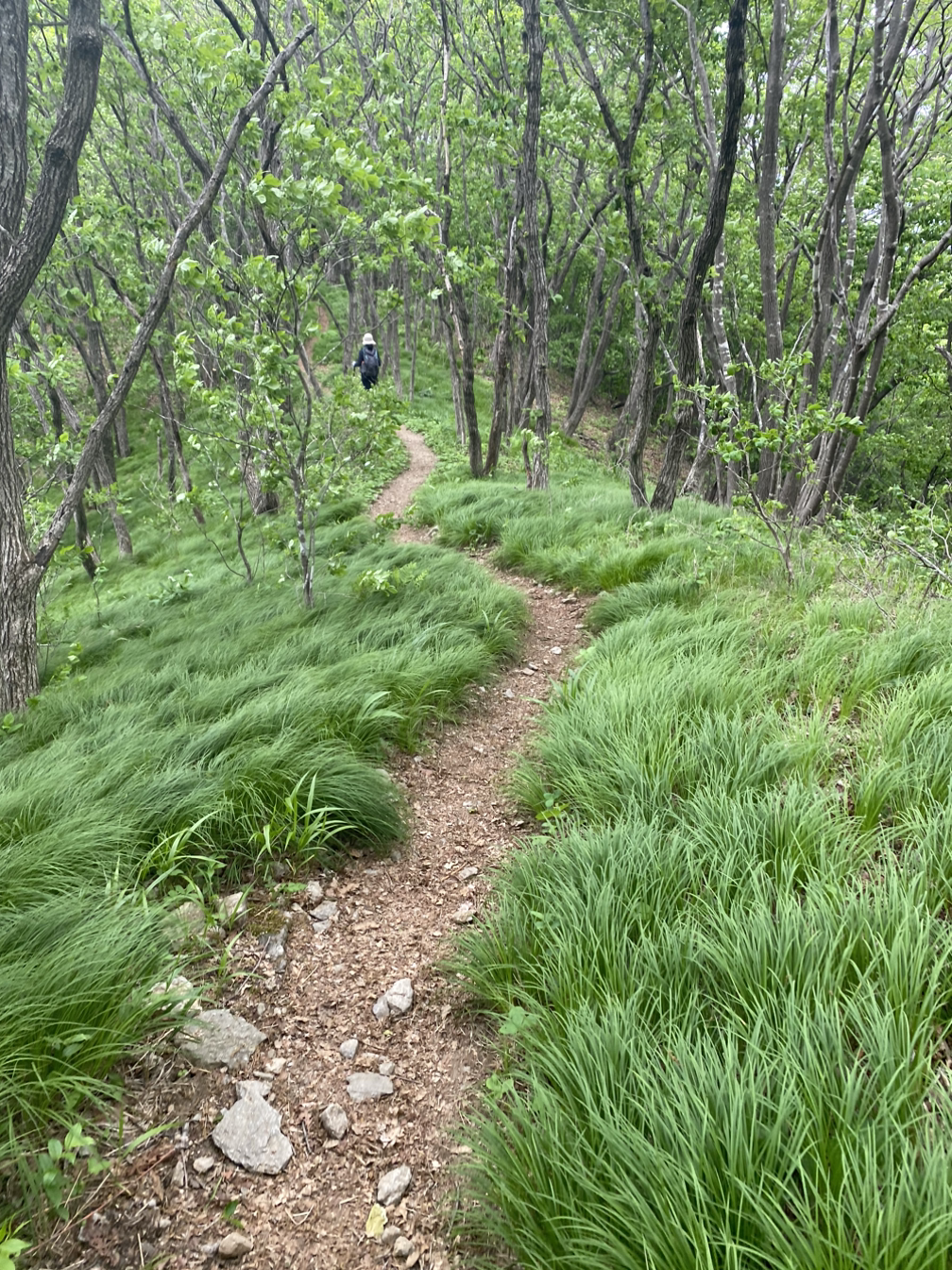 비로봉에서부터는 내리막이거나 편안한 능선이 이어질 거라 생각했다. 막연히. 비로봉에서 상원사 가는 길은 거리가 좀처럼 줄어들지 않았다. 게다가 비로봉에서 곧은재 가던 길에 허리에 갑자기 '찌릿~'하는 통증이 지나가서 나도 모르게 "아~악" 짧은 신음소리를 내며 앞에 가던 B를 불렀다. 그 전주에 1박 2일 수학여행, 그 주에 4일간의 학생 야외 체험 인솔로 허리가 고장이 난 상태였는데 걷는 데는 지장이 없던 허리였다. 놀란 B. 배낭을 달라고 하더니 내 배낭을 앞으로 멨다. 몇 걸음 가는가 싶더니 안 되겠다며 배낭을 다시 풀었다. 앞으로 배낭을 메니 발 내딛는 곳이 안 보여서 위험하다고 했다. 내 배낭의 짐을 모두 빼서 B가방에 넣고 나는 빈가방을 메고 걸었다. 가방의 모두 짐을 넘기자 그 후로는 거짓말처럼 허리가 아프지 않았다.