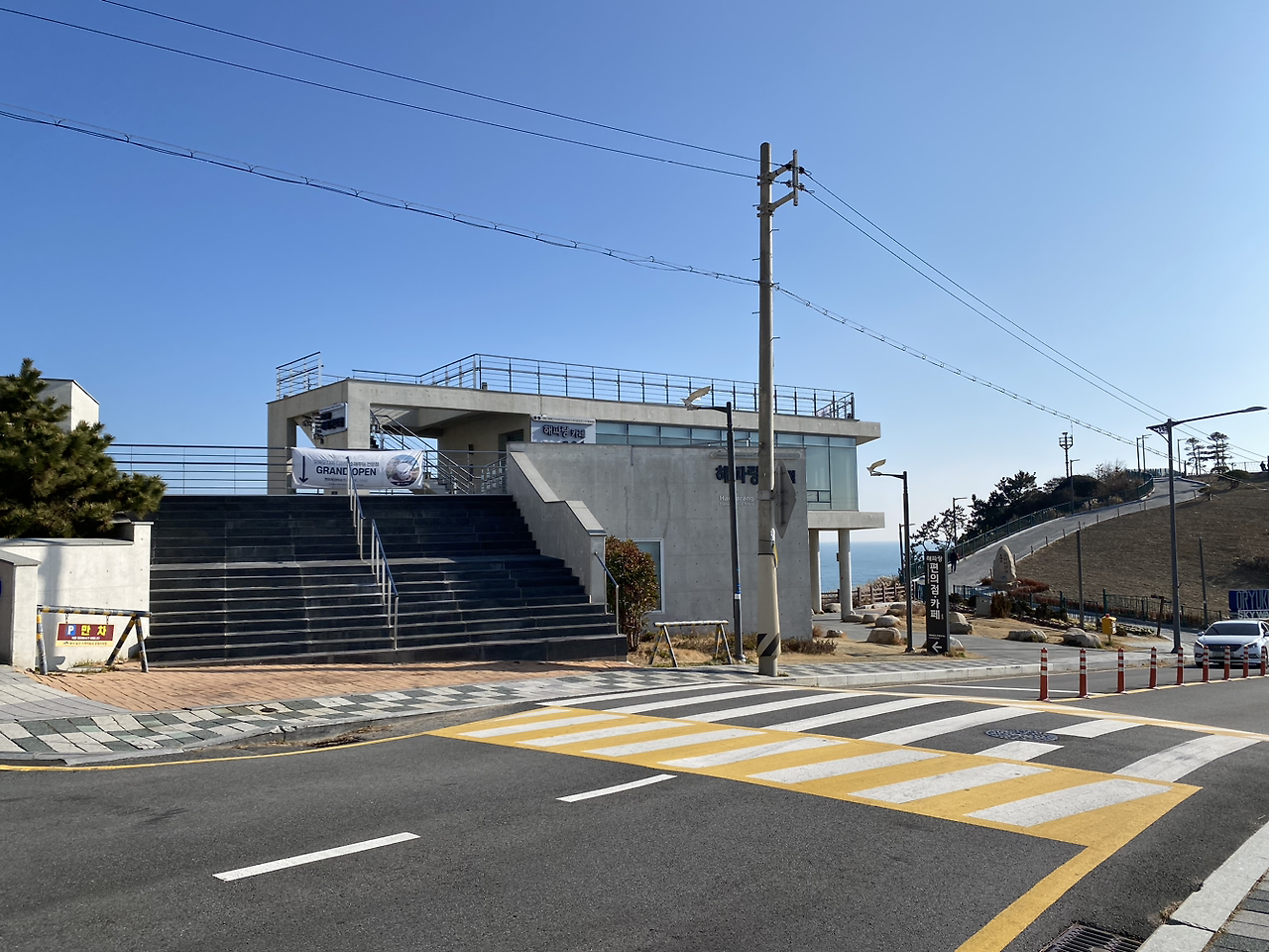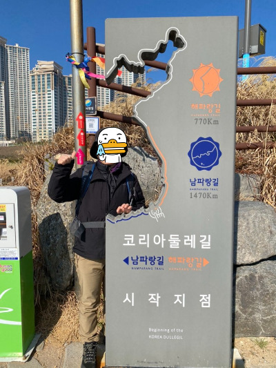 해파랑길의 시작을 알려주는 1코스 스탬프함은 해파랑길 관광 안내소 바로 옆 이기대 올라가는 입구에 세워진 코리아 둘레길 안내도 옆에 있었다. 거기서부터 시작인 줄 알고 걸어가려는데 k가 해파랑길을 다녀온 사람들이 해파랑길을 시작하며 한반도 지도 있는 곳에서 사진 찍은 걸 봤다고 했다. 검색해 보니 오륙도 스카이워크 밑에 그 표지판이 있다고 되어 있어서 거기까지 내려가서 기념사진을 찍었다.