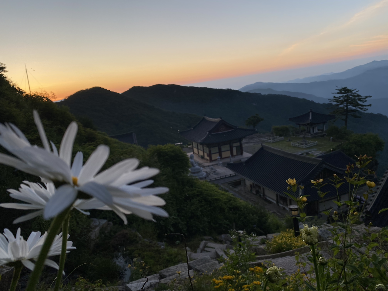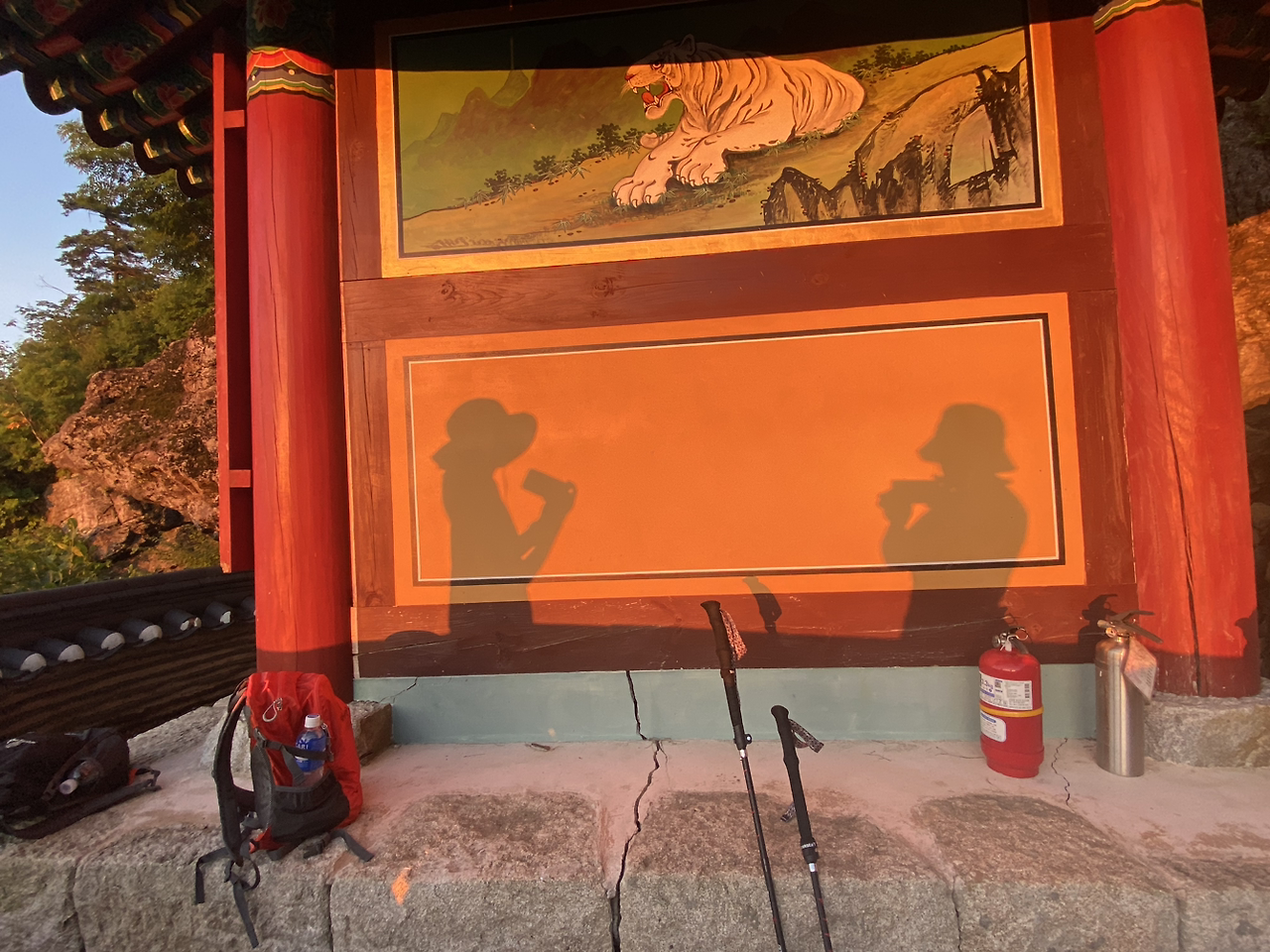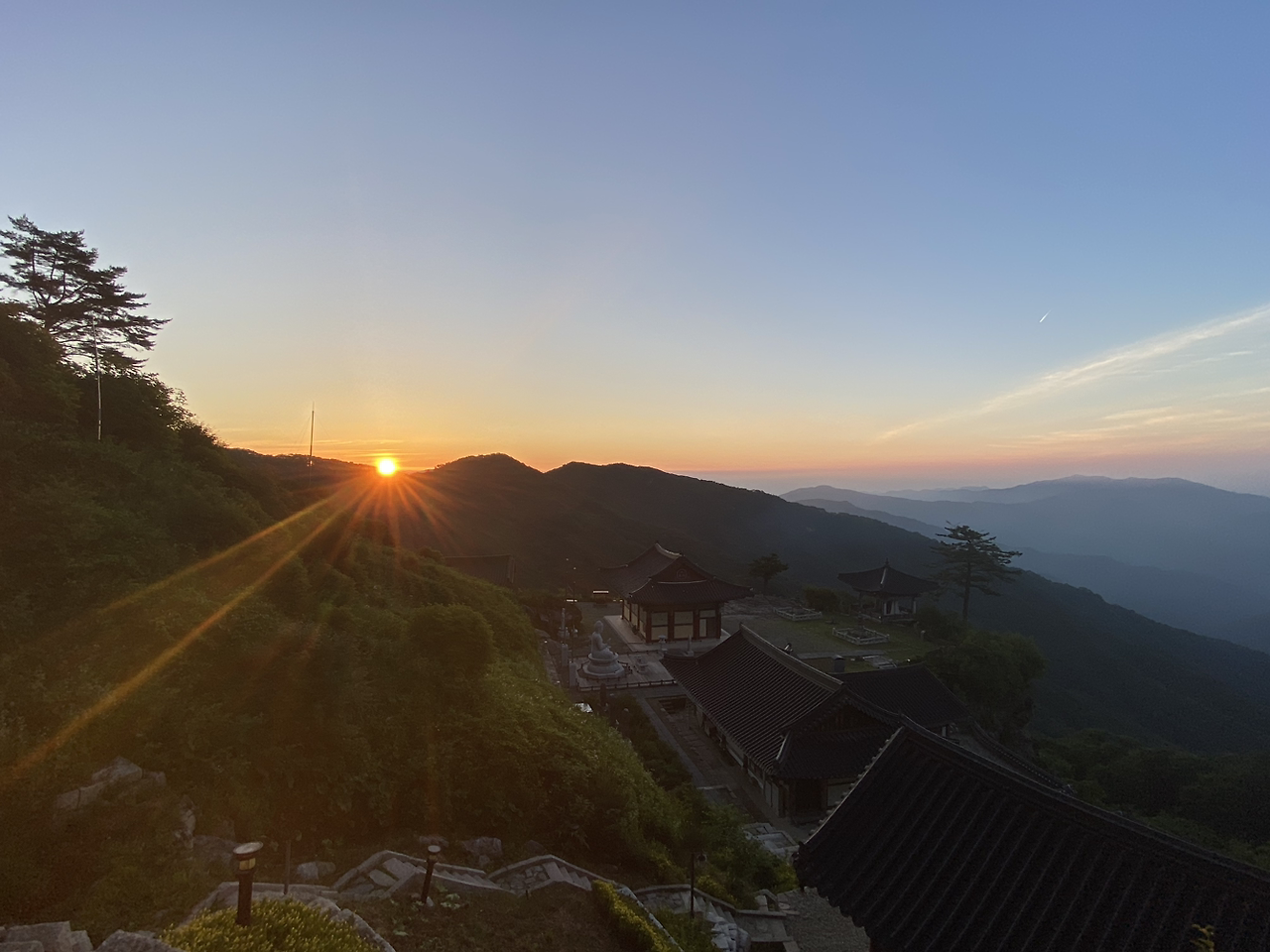우리나라에서 세 번째(1등은 지리산 법계사, 2등은 설악산 봉정암)로 높은 곳에 있는 사찰이라는 상원사, 그중에서도 가장 높은 곳에 위치한 산신각에 올라가서 일출을 기다렸다. 일출 장면을 놓칠까 봐 쉬지 않고 걸은 덕분에 일출시간까지는 20분 정도 여유가 있었다. 느긋하게 쉬면서 해뜨기 전 풍경을 감상하고 싶었다.