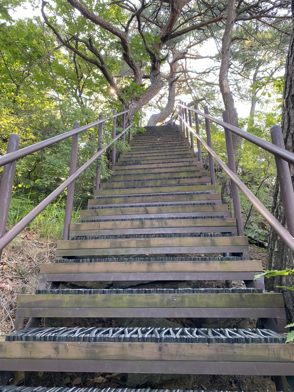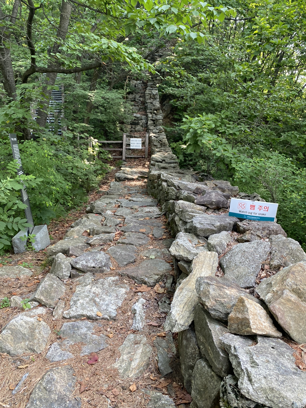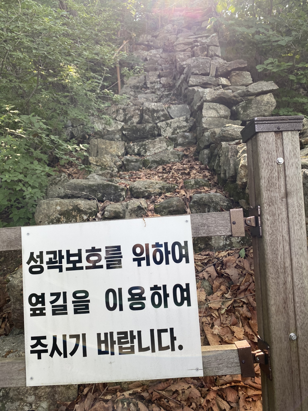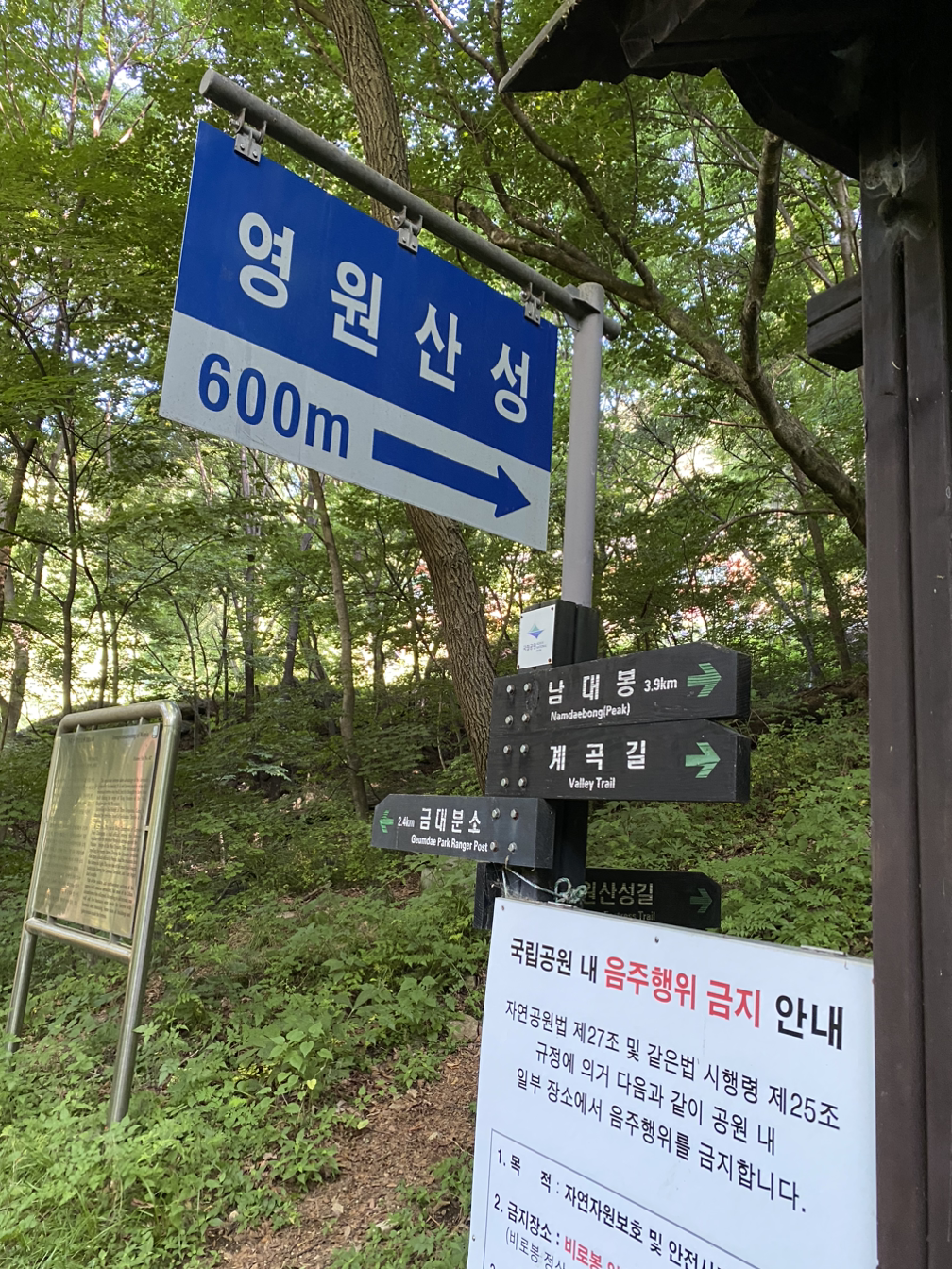 그렇다고 영원산성을 안 보고 갈 수는 없는 일. 영원산성까지는 600m라고 적혀있었다. 600m쯤이야하고 생각했지만 영원산성을 보러 올라갔다가 영원사로 내려오는데 1시간 이상 걸렸다. 그만큼 가파른 구간이었다. 9시 28분에 영원사에 도착했다. 영원사 마당에 있는 나무 그늘 아래 평상에서 등산화를 벗고 쉬는데 나들이온 아주머니 대여섯 분이 우리 옆에 도시락을 꺼내놓았다. 산에서는 보통 옆에 사람이 있으면 모르는 사람이라도 먹을 것을 권하기도 하는데 그분들은 그러지 않았다. 그런 말을 b에게 했더니 먹고 싶었는데 안 줘서 그런 거냐고 놀렸다.