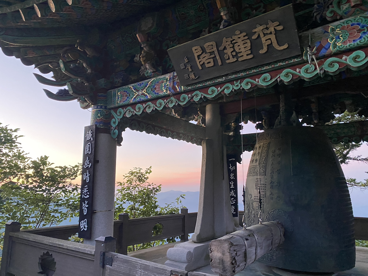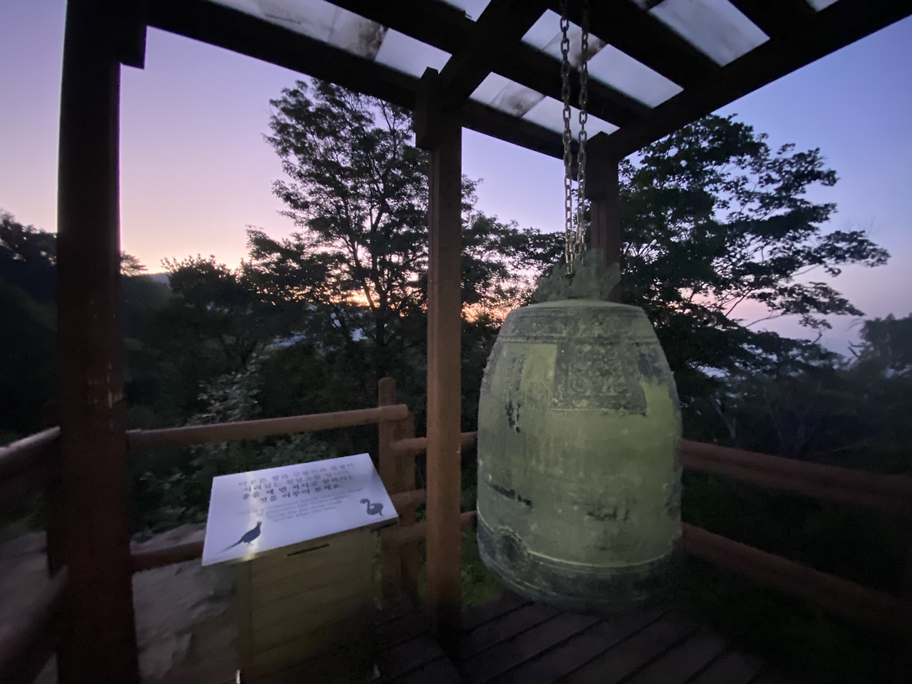 걷다 보니 상원사 일주문이 보였다. 4시 45분이었다. 1시간 30분 예상하고 걸었는데 얼마나 빨리 걸었는지 1시간 만에 도착한 것이었다. 은혜 갚은 까치 전설이 있는 종에 도착하니 4시 49분이었다. 노크하듯 손으로 세 번 작게 두드리며 가족들의 안녕을 빌었다.