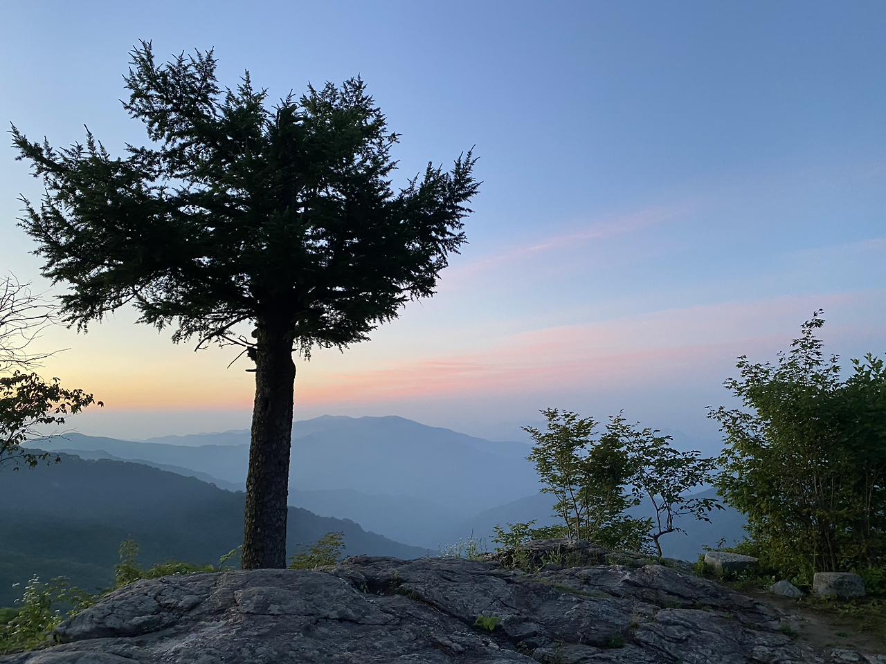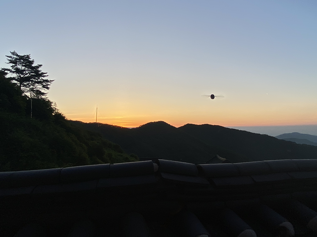 그러나 벌 때문에 그럴 수가 없었다. 땀냄새를 맡고 온 것인지 까만 옷을 입어서 곰인 줄 알고 공격하는 것인지 벌들이 유난히 b에게 많이 달라붙었다. 내가 입은 파란 옷도 까만색으로 보이는지 b만큼은 아니지만 내게도 벌들이 웽웽거리며 모여들었다. 벌 피하랴, 사진 찍으랴, 경치 구경하랴. 그러는 사이 해가 떴다. 순식간에 먼 산 위로 작고 빨간 동그라미가 쏘옥 올라왔다.