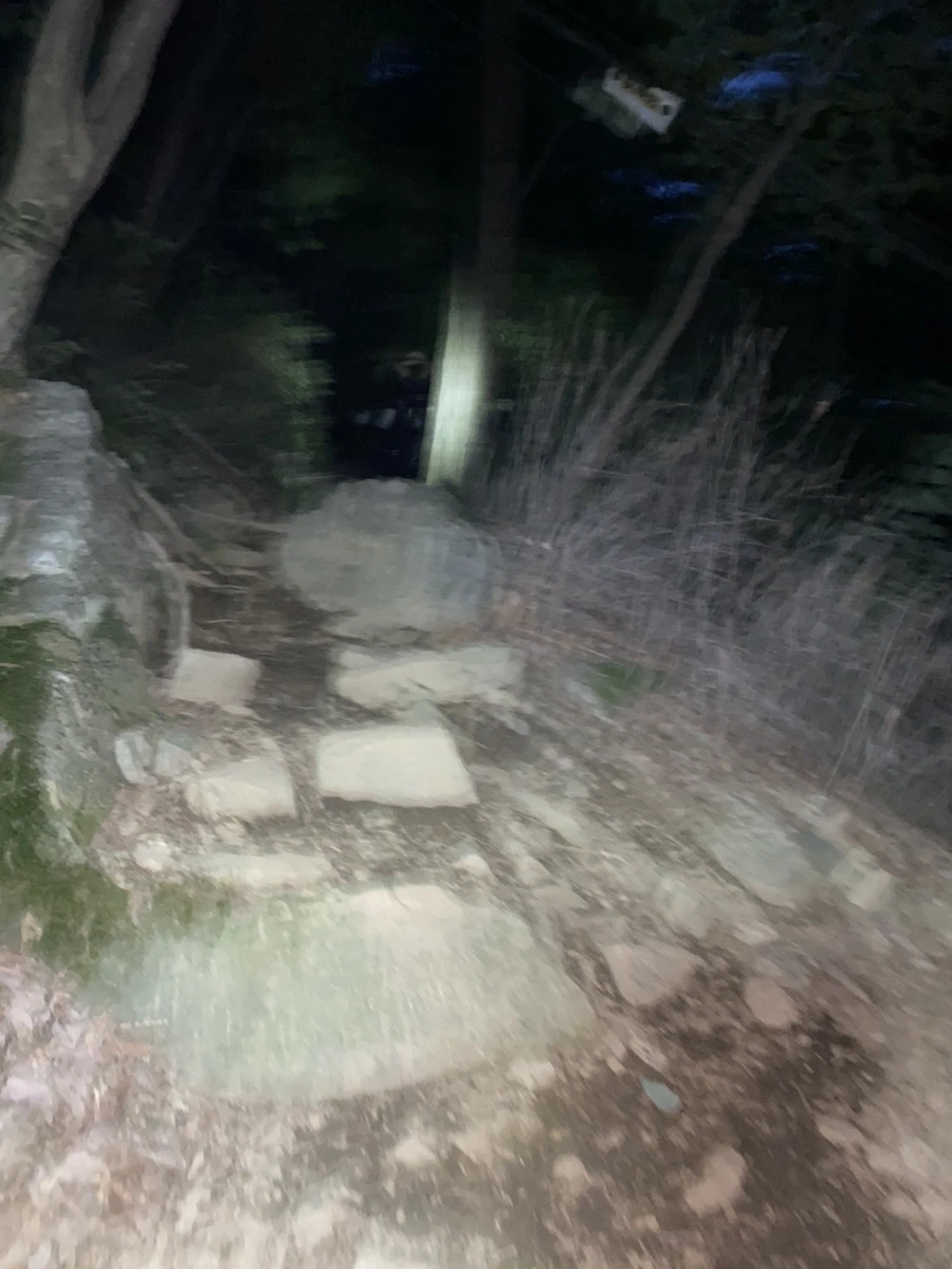 계속 그러고 놀 시간이 없었다. 랜턴을 켜고 다시 걸었다. 물소리 새소리가 들려왔다. 앞서가는 b 따라 걸으랴, 계곡 건너편에는 뭐가 있나 쳐다보랴, 넘어지지 않게 바닥 쳐다보랴 사진 찍을 틈도 없었다. 물을 마시기 위해 두 번 정도 멈추고는 또 걸었다. 몸이 데워지기 시작하니 콧물이 나왔다. 멈춰 서서 휴지를 꺼낼 시간이 없었다. 한쪽 콧구멍을 누르고 반대편 콧구멍으로 바람을 불어서 콧물을 빼내는 방식으로 코를 풀었다.