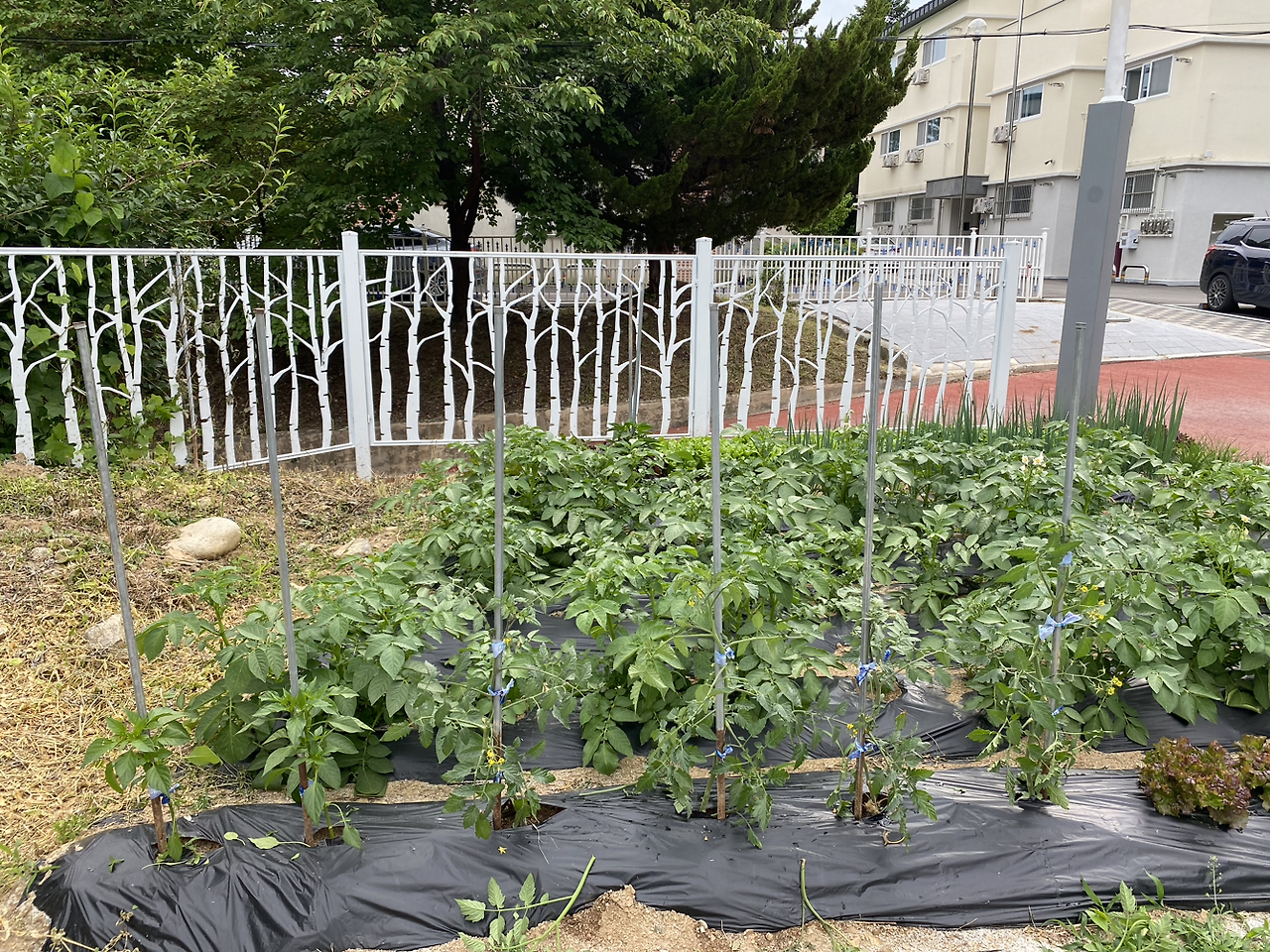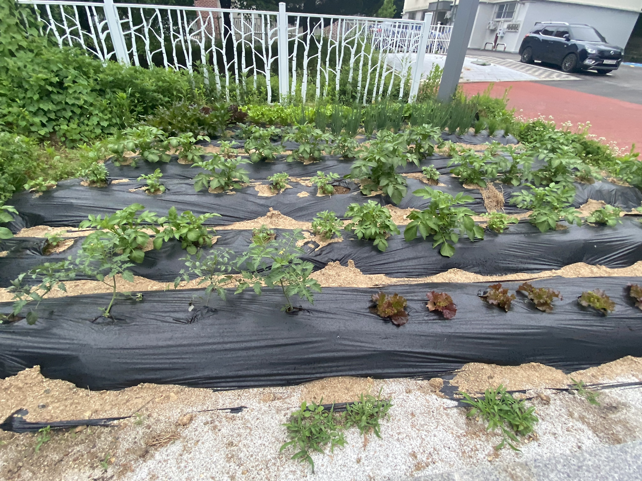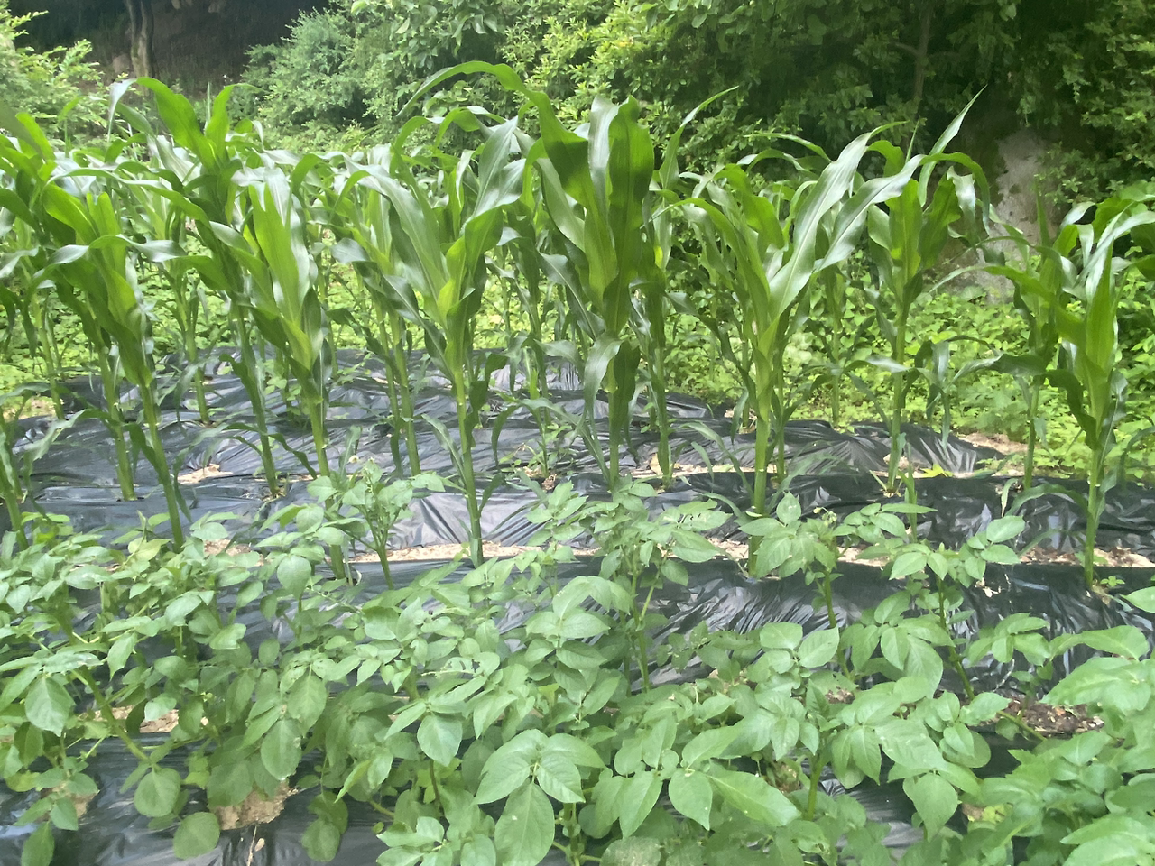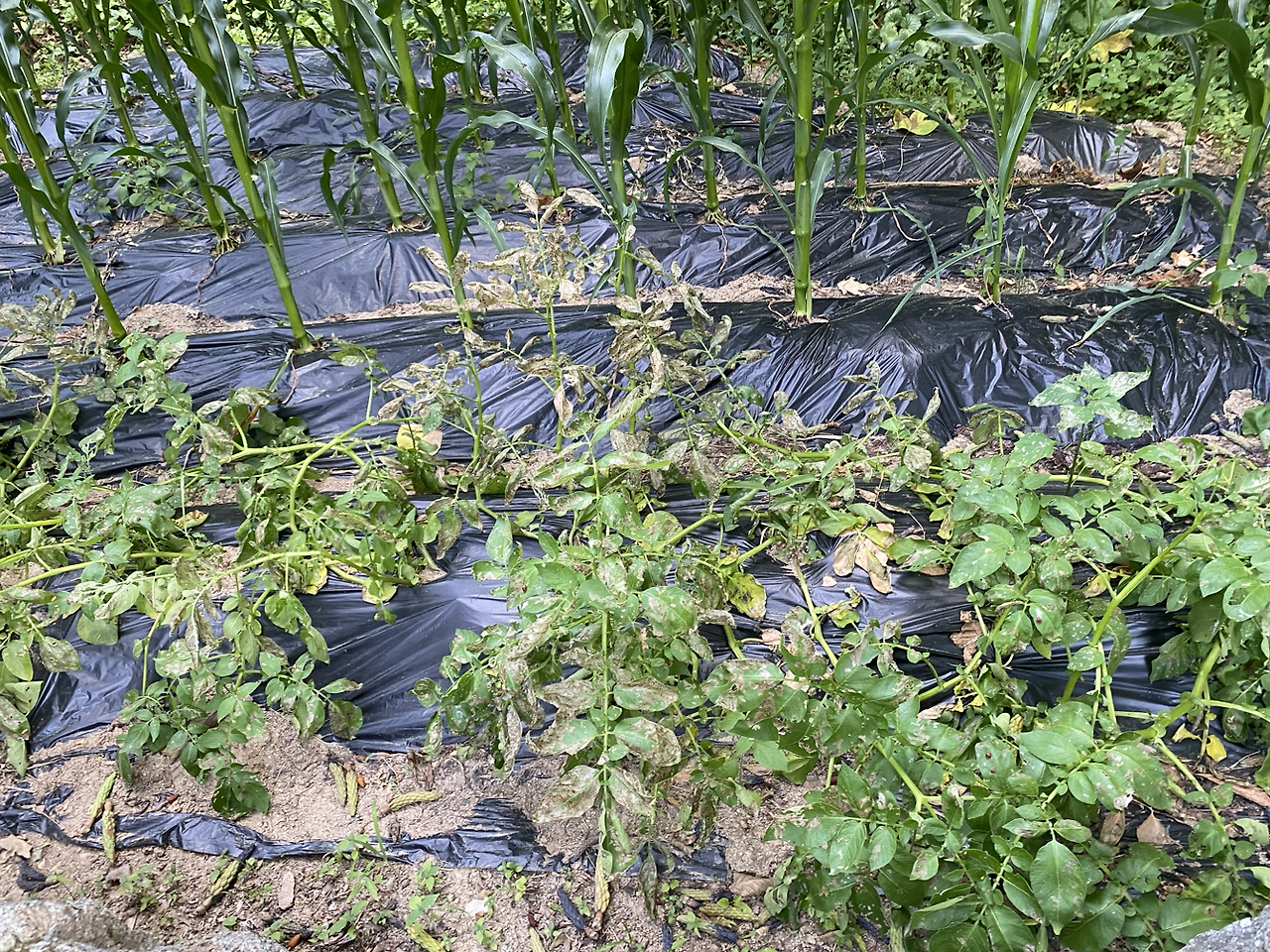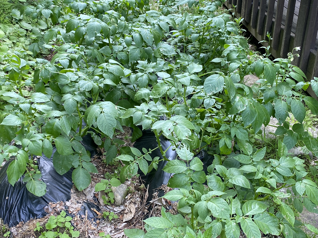보통은 감자눈 있는 부위를 잘라서 심는데 올해 씨감자는 작아서 그런지 칼로 자르지 말고 그냥 한 덩이씩 심으라고 해서 그렇게 했더니 순이 많이 올라왔다. 올라온 순을 한 두 개씩만 남기고 뽑아낸 것(순지르기) 말고는 특별히 한 게 없다. 두 곳 모두 감자씨를 묻어두고 물만 몇 번 주고 풀도 뽑지 않았다.