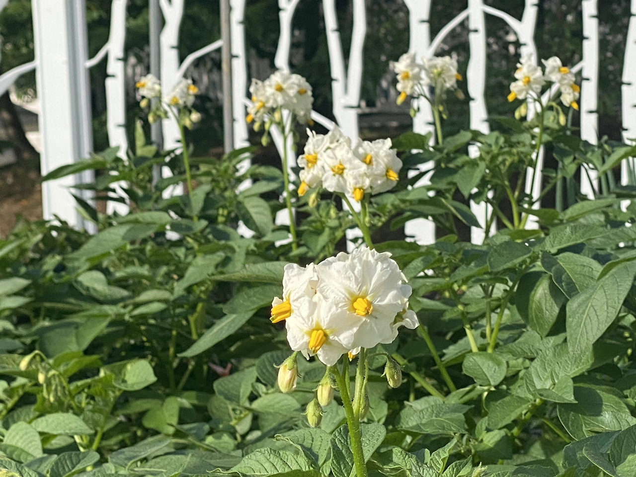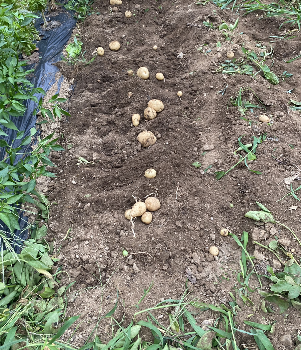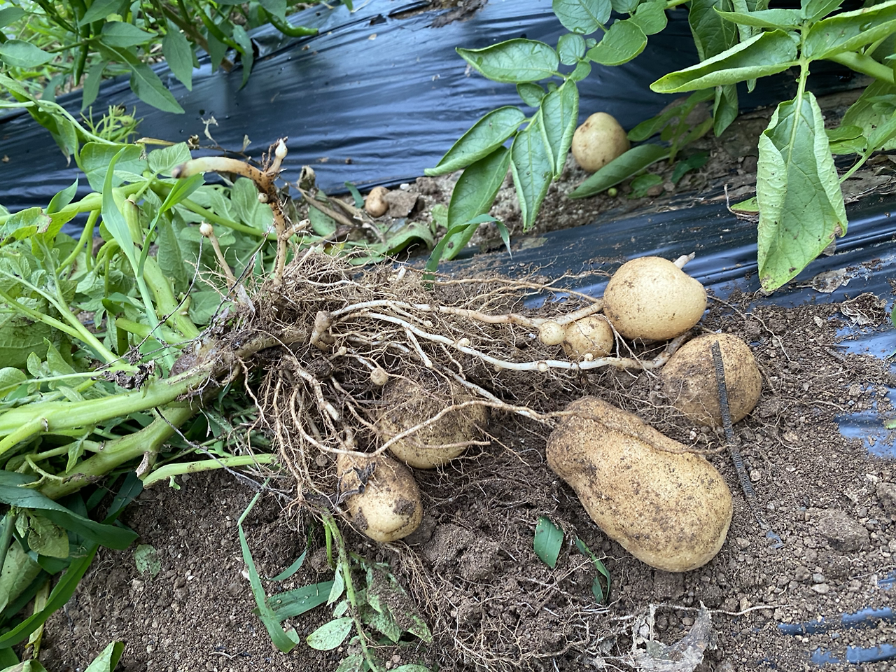 원주집은 해가 잘 들지 않는 곳에 텃밭이 있어서 감자 줄기가 가늘고 긴 연두색으로 자랐고 인제 텃밭은 해가 잘 들어서 감자 줄기와 이파리가 초록색으로 짱짱하게 잘 자랐다. 심기는 인제 텃밭에 먼저 심고 남은 것을 일주일 뒤에 원주집 텃밭에 갔다 심었는데 캘 때는 원주집 감자를 2주 먼저 캤다.