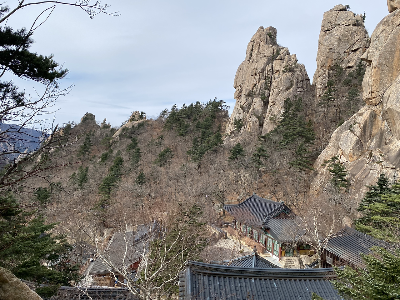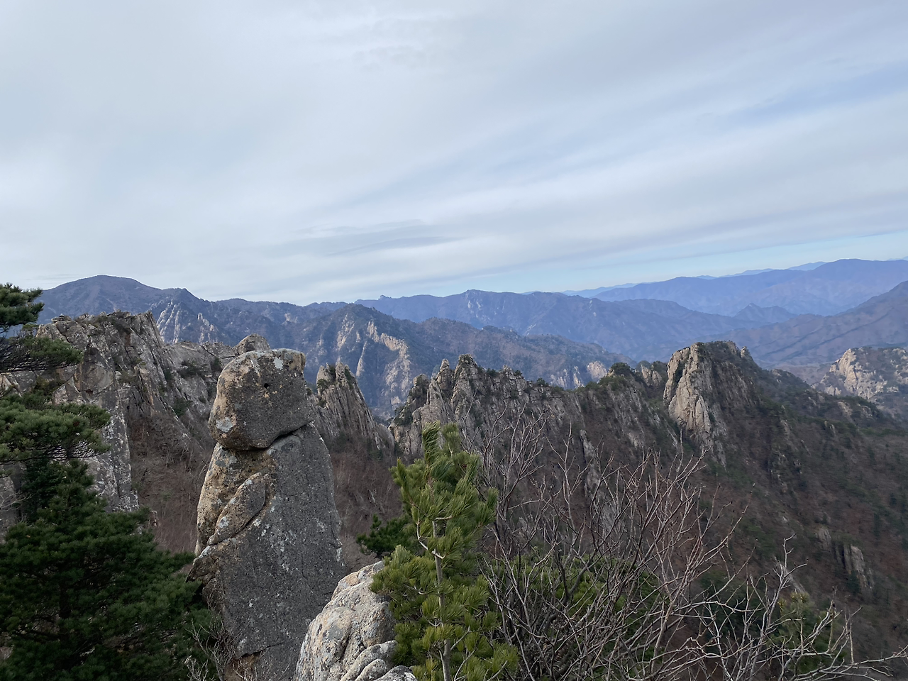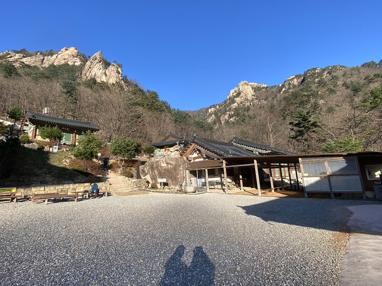 점심을 먹고 난 후 어슬렁 거리다 적멸보궁 안내판을 봤다. 계단 앞에서 망설이다 계단에서 내려오는 분들께 적멸보궁에 뭐 볼 거 있냐는 무식한 질문을 했다. '너무 좋아요, 올라가 보세요'라는 말을 듣고 올라간 적멸보궁. 설악산 능선 풍경이 통유리를 통해 적멸보궁 안으로 가득 들어와 있었다. 하마터면 이 풍경을 못 보고 갈뻔했다고 생각하니 부끄러워졌다. 시주도 하고 a는 절도 했다. 적멸보궁에서 나와서 맞은편 사리탑쪽으로 올라갔다. 절 하는 사람들과 사진 찍는 사람들이 있었다. 우리는 사리탑 뒤 전망대로 올라갔다. 그곳에 세워진 낡은 안내문을 보면서 용의 이빨(용아장성)과 용의 등뼈(공룡능선)를 찾으며 하늘이 파랬으면 더 좋았겠다 생각했다. 하늘이 회색이었다. 그래도 좋았다.