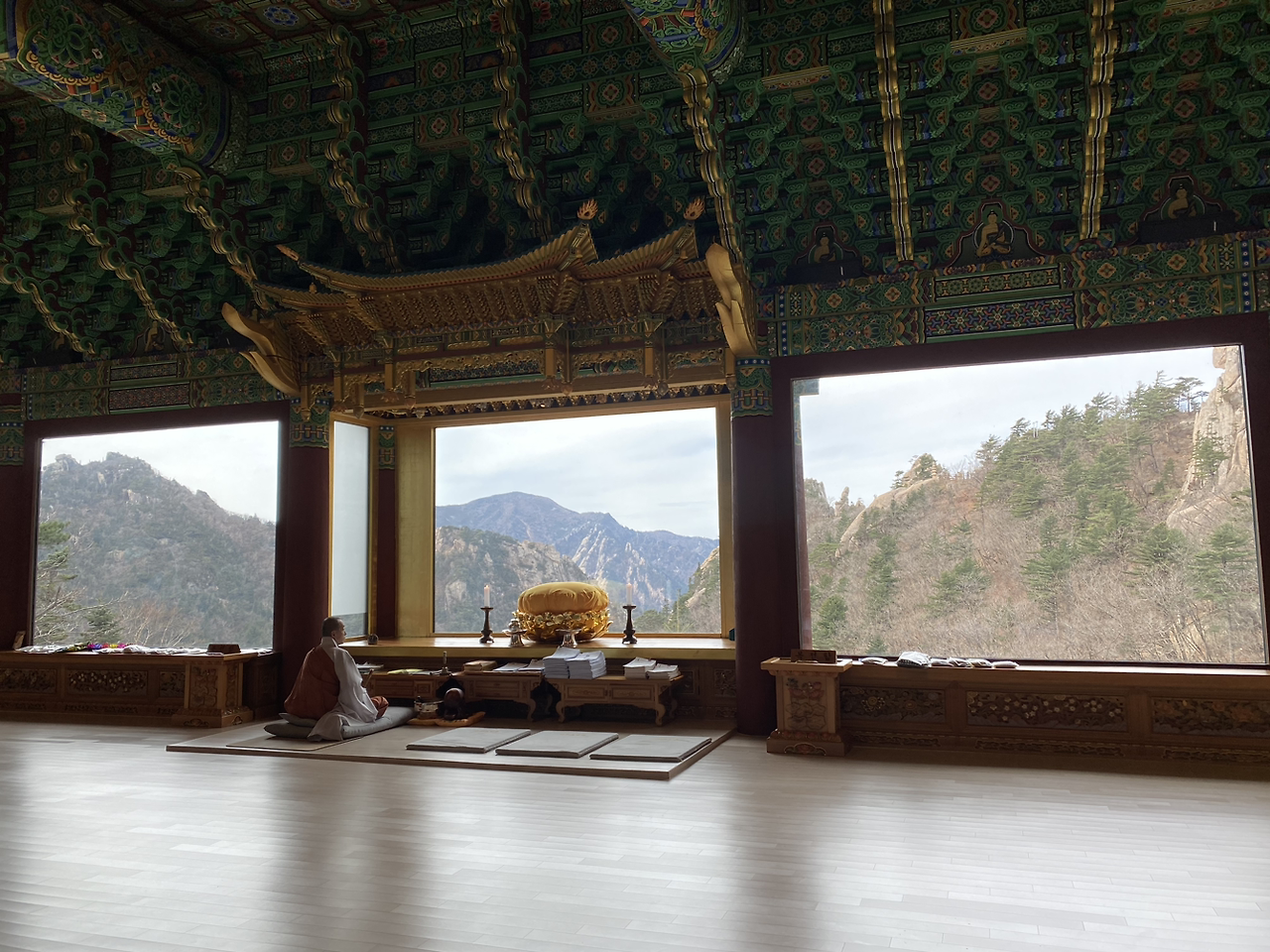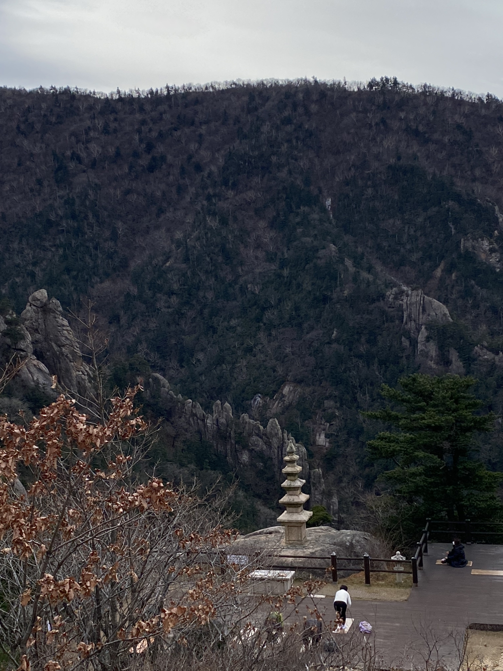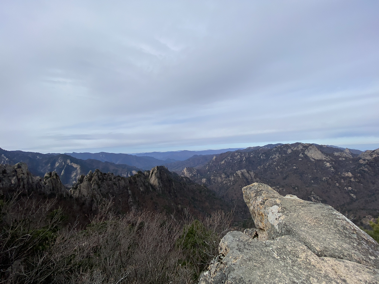 점심을 먹고 난 후 어슬렁 거리다 적멸보궁 안내판을 봤다. 계단 앞에서 망설이다 계단에서 내려오는 분들께 적멸보궁에 뭐 볼 거 있냐는 무식한 질문을 했다. '너무 좋아요, 올라가 보세요'라는 말을 듣고 올라간 적멸보궁. 설악산 능선 풍경이 통유리를 통해 적멸보궁 안으로 가득 들어와 있었다. 하마터면 이 풍경을 못 보고 갈뻔했다고 생각하니 부끄러워졌다. 시주도 하고 a는 절도 했다. 적멸보궁에서 나와서 맞은편 사리탑쪽으로 올라갔다. 절 하는 사람들과 사진 찍는 사람들이 있었다. 우리는 사리탑 뒤 전망대로 올라갔다. 그곳에 세워진 낡은 안내문을 보면서 용의 이빨(용아장성)과 용의 등뼈(공룡능선)를 찾으며 하늘이 파랬으면 더 좋았겠다 생각했다. 하늘이 회색이었다. 그래도 좋았다.