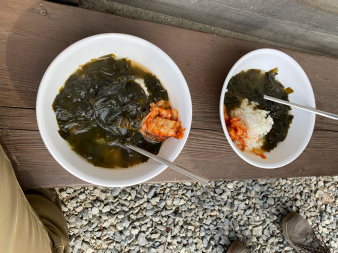 11시 30분경에 봉정암에 도착하자마자 바로 공양간을 찾아갔다. 마침 점심 공양이 시작되고 있었다. 큰 기대를 안고 미역국밥을 받아 들고 공양간 밖으로 나가 나무 벤치에 앉았다. 사골 국물은 아니더라도 참기름이나 들기름이 들어간 미역국을 기대했었다. 미역을 물에 빠트려서 소금과 약간의 간장을 넣어 끓인 듯한 미역국에 밥 한 주걱, 그리고 그 위에 김치 몇 조각을 얹은 미역국밥은 너무나도 소박한 맛이었다. 신도인지 등산객인지 묻지 않고 시주를 했는지 안 했는지 따지지 않고 누구에게나 똑같이 한 그릇. 먹고 나서 설거지도 스스로. 그리고 햇빛을 받으며 파노라마처럼 펼쳐진 설악산의 풍경을 감상하며 믹스 커피까지 홀짝거리니 감동과 감사와 평온이 몰려왔다.