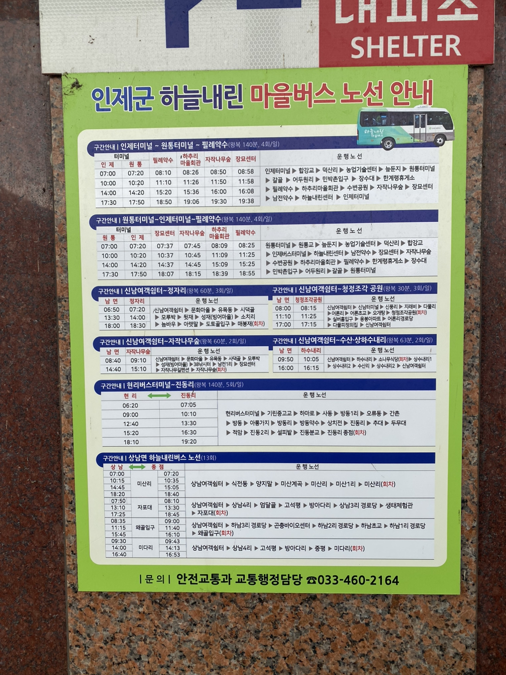 버스표를 받고 바로 터미널 밖으로 나갔다 기사님께서 나를 발견하지 못하고 출발하면 안 되니까. 터미널 바깥 버스 기다리는 곳에서 터미널 유리벽에 붙은 인제마을버스 시간표 사진을 찍었다. 인제 떠나기 전에 저 15인승 마을버스를 한번 더 타보고 싶은데 시간이 날까.