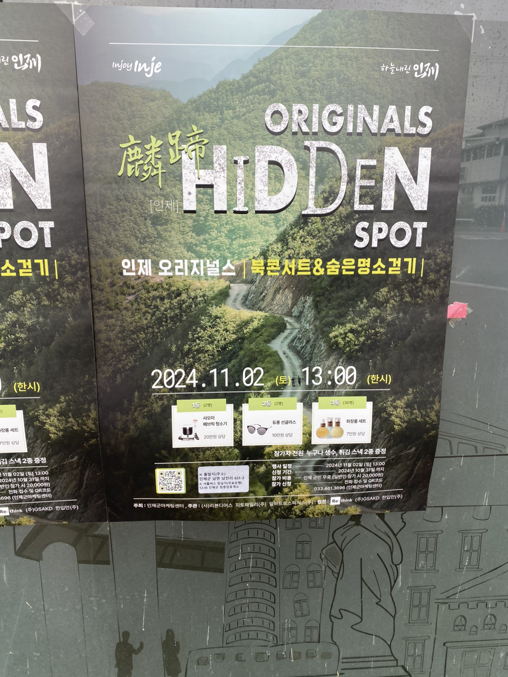 그 옆에 작은 포스터 하나가 붙어있다. 인제 오리지널스 히든 스팟이라고 적혀있고 날짜는 11월 2일이라고 되어있다. 인터넷으로 찾아보니 2019년 봄에 고성에서 난 산불이 속초까지 번졌을 때 인제에도 산불이 크게 났었는데 그 산이 회복되는 모습을 둘러보는 걷기 행사였다. 보자마자 큐알코드를 찍어서 참여 신청을 했다. 의미 있는 걷기 행사인데 너무 구석진 곳(일부러 사람들 눈에 안 띄는 히든 스팟에 붙이려 했던 건 아닐 텐데)에 포스터를 붙여놨다는 느낌이었다.
