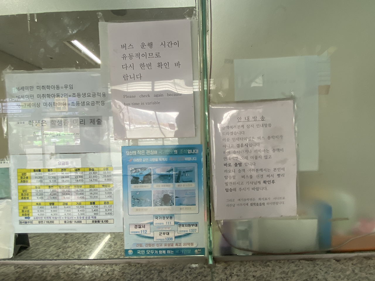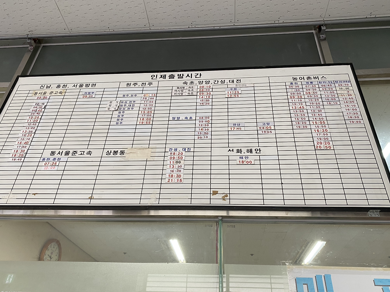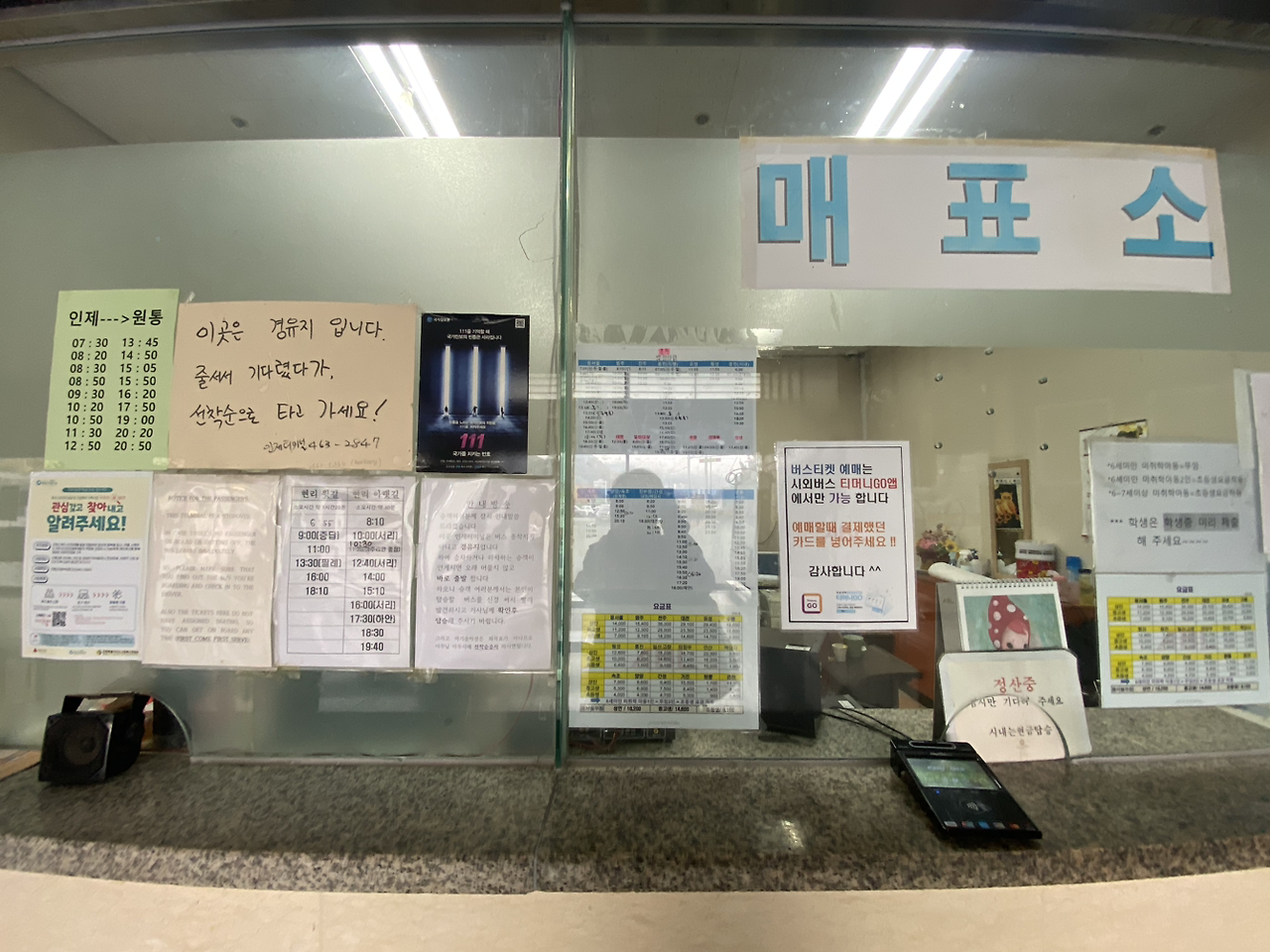 '원통, 속초'라 적힌 버스가 9시 35분쯤에 터미널로 들어오는 게 보였다. 버스 앞으로 빠르게 다가갔다. 버스문이 열리자마자 '본인이 탑승할 버스를 신경 써서 빨리 발견하시고 기사님께 확인 후 탑승'하기 위해 기사님께 물었다. "기사님 이거 8시 반 속초 가는 버스 맞나요?" 했더니 "아닙니다"라는 답이 돌아왔다. 9시 반 표를 끊어놓고 뜬금없이 8시 반이라니. 인제 오리지널스 히든 스팟 구경에 정신을 너무 많이 팔았나 보다.