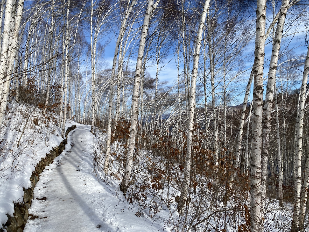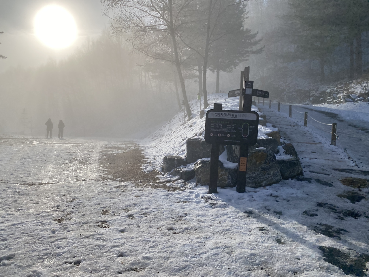 왼팔 삼두근 쪽이 아프다. 어제는 괜찮더니 자고 일어나니 그렇다. 중부지역에 역대급 폭설이 첫눈으로 내렸다는데 인제는 눈이 그렇게 많이 오지는 않았다. 지난주 화요일에 10cm 정도 눈이 쌓였고 수요일, 목요일에는 간간이 흩날리는 정도였다. 토요일에 인제읍을 한 바퀴 돌고(2시간 정도) 집에서 쉬다가 갑자기 눈이 다 녹기 전에 자작나무숲에 한 번 다녀와야겠다는 생각이 들었다. 자작나무숲 안내소에 전화해서 입산할 수 있냐고 물었더니 아이젠과 스틱을 준비해서 2시 이전에 입산하라는 안내를 받았다.