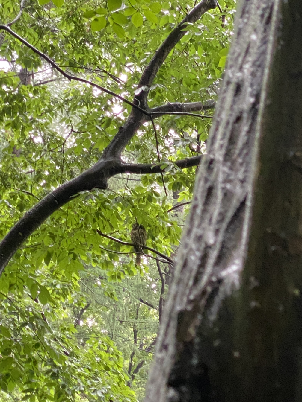 올라갈 때 올빼미 사진을 찍지 못한 게 아쉬워서 내려오는 길에 올빼미가 있는 곳을 찾아서 사진을 찍었다. 올빼미와 둥지를 좀 더 오래 바라보고 싶었지만 맨 꼴찌로 걷던 내 뒤를 따라오던 책임감 강한 연구사님을 생각해서 사진만 찍고 서둘러 내려왔다. 연수를 마치고 집으로 돌아와서도 비를 맞고 있던 어미 올빼미의 모습이 떠오르면서 부모와 자식 간의 거리에 대한 생각으로 이어졌다. 저만치 떨어져서 늘 나를 지켜보고 계셨을 돌아가신 부모님 생각이 났다. 올빼미 새끼들도 어미가 비를 맞으며 자신들을 지켜보고 있었다는 것을 아주 나중에서야 알게 되겠지.