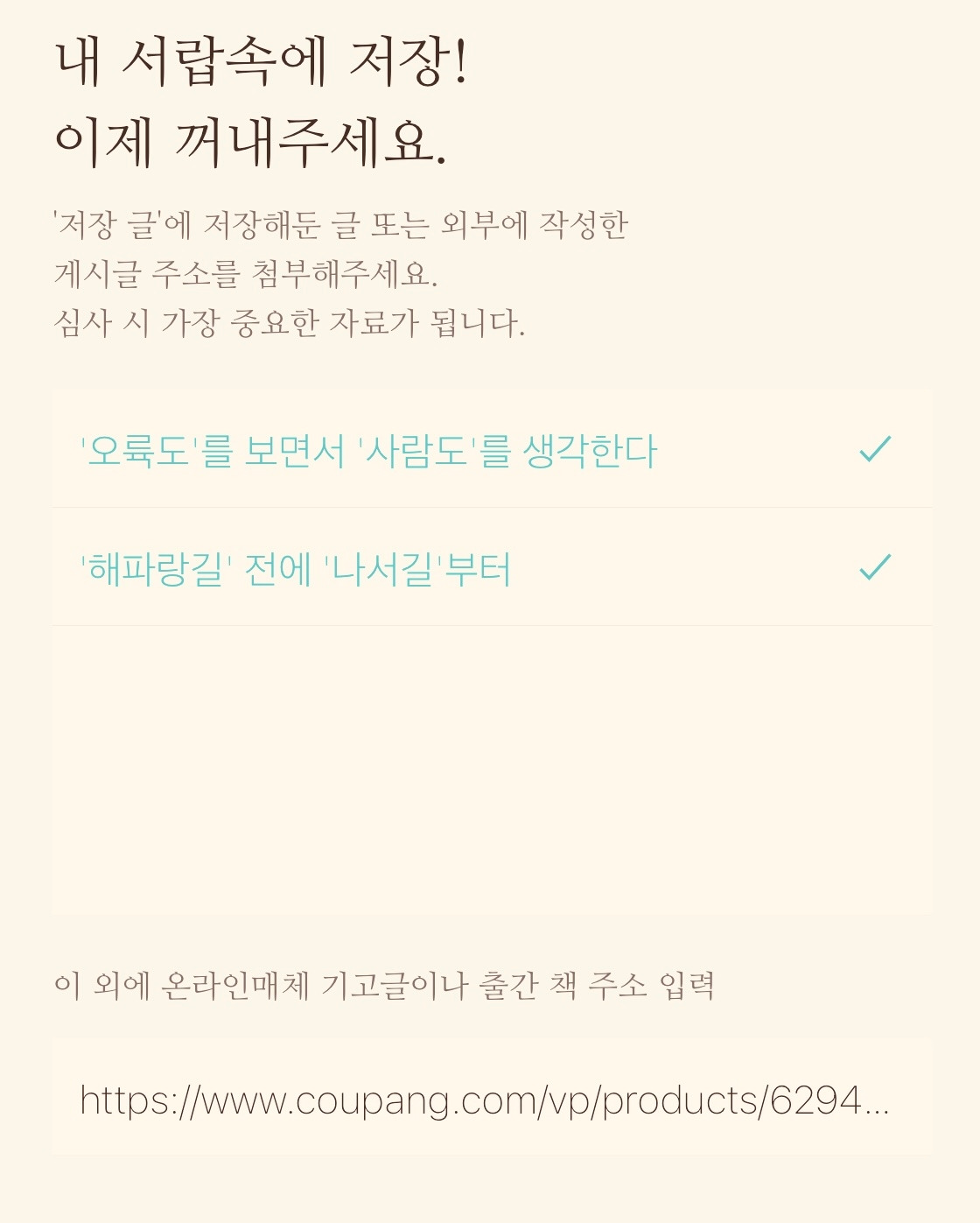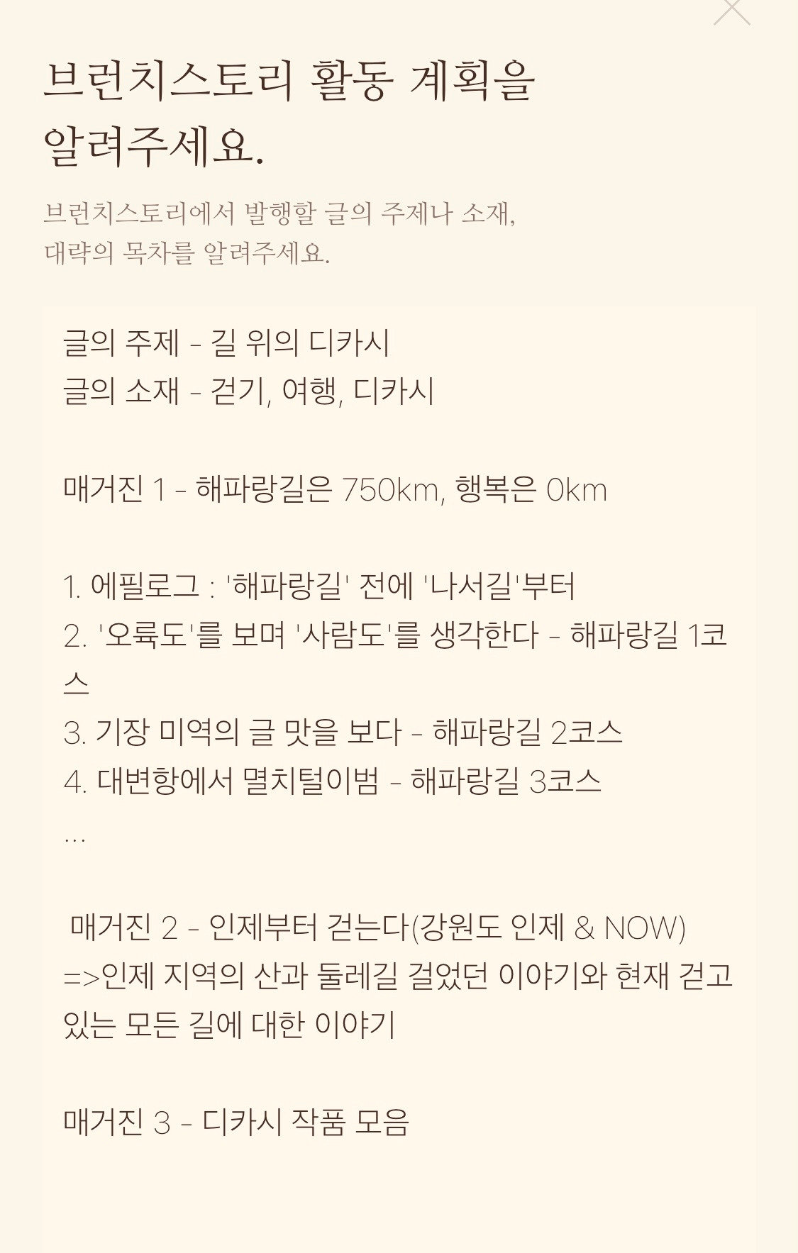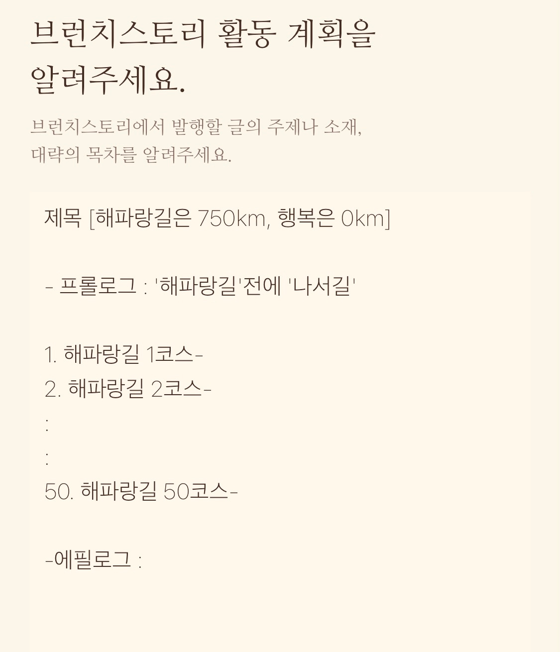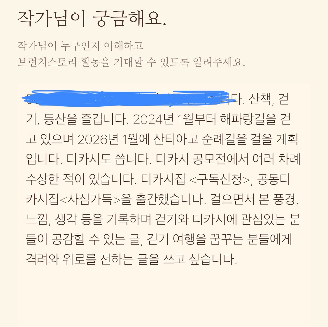 그러다 올해 해파랑길 걷기를 시작하며 기록을 남기고 싶다는 생각에 다시 브런치 작가 신청을 하기로 결심했습니다. 이번에는 브런치 작가 합격하는 법에 관한 글도 좀 읽고, 유튜브 영상도 서너 개 봤습니다.