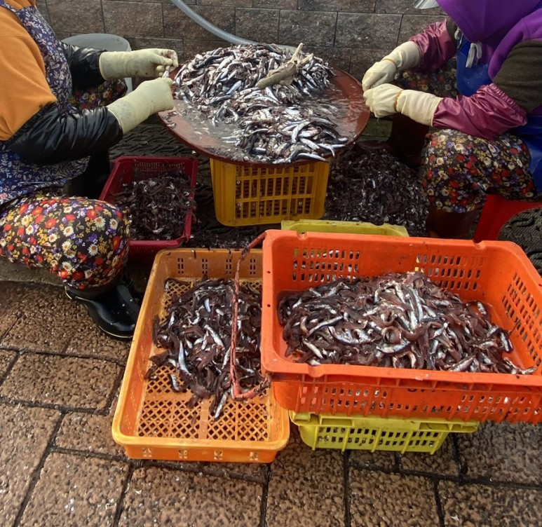 8시경에 숙소를 나왔다. 대변항 멸치털이 장면을 보고 싶었는데 제철이 아니라 볼 수 없었다. 대신 새벽에 바다로 나간 배들이 건져 올린 미역을 정리하는 모습을 봤다. 일하는 분들의 사진을 찍을 때는 뒷모습이라도 죄송한 마음이 든다. 얼른 한 컷만 찍고 지나갔다. 멸치광장을 지나 봉대산으로 꺾어지는 지점에서 할머니 두 분이 생선을 다듬고 계시는 것이 보였다. 반가운 마음에 가까이 가서 '이게 혹시 멸치예요?' 하며 호들갑을 떨면서 여쭤봤더니, '이건 횟거리, 이건 구이 하는 거, 이건 젓갈 담그는 거' 하면서 가르쳐 주셨다. 갈길이 멀기도 하고 어르신들이 일하시는데 계속 보고 서서 말 붙이는 것도 실례다 싶어 잠시 보다가 봉대산 쪽으로 올라갔다.