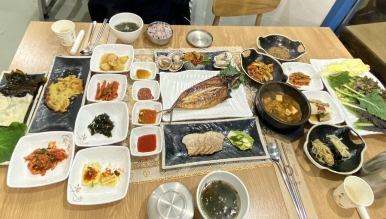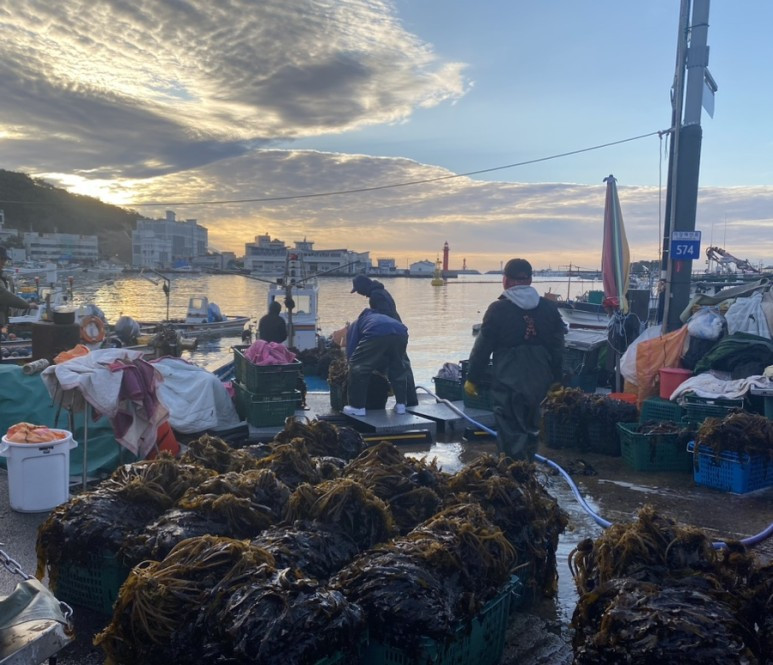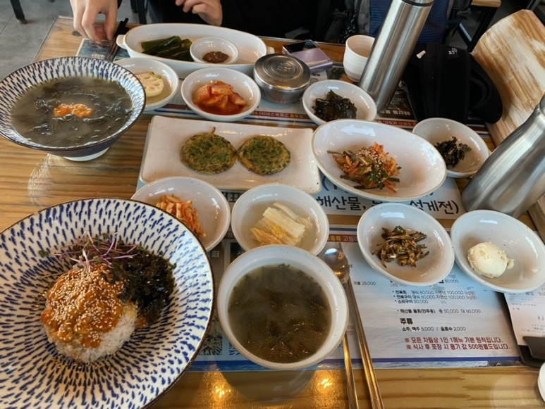 1시쯤 동백항에 도착했다. 새벽에 검색해서 점찍어둔 아라&진 식당에 가서 성게미역국과 성게비빔밥을 시켰다. 밑반찬까지 깨끗하게 다 먹고 조금 쉬다 다시 걸었다. 일기예보에 오후에 비가 온다는 표시가 되어있어서 비 오기 전에 코스를 마치고 싶었기 때문이다. 칠암항을 지날 때는 길가 빈터에 가오리와 붕장어를 말리고 있는 곳이 많이 보였다.