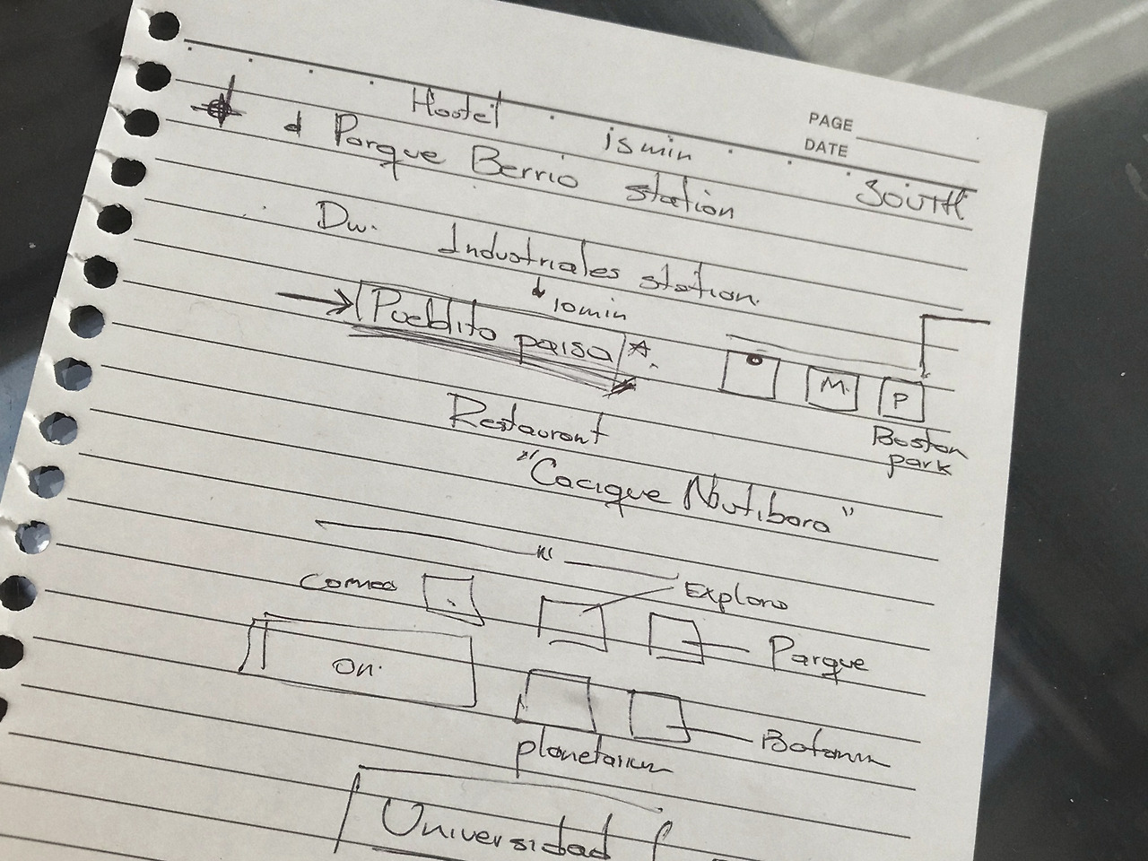 사실 우리는 메데인 시내에 대한 어떠한 정보도 갖고 있지 않았다. 오늘 계획도, 내일 계획도, 내일 모레 계획도 없었다. 후안은 한쪽 눈썹을 들썩이며 흰 종이 위에 지하철은 어디에서 타야 하는지, 메데인의 대표 음식은 무엇인지, 메데인에서 무얼 보고 가면 좋은지 등 하나부터 열까지, 알고 있으면 유용할 정보들을 적어 내려갔다. 당장 오늘의 일정을 함께 고민하기도 했다.