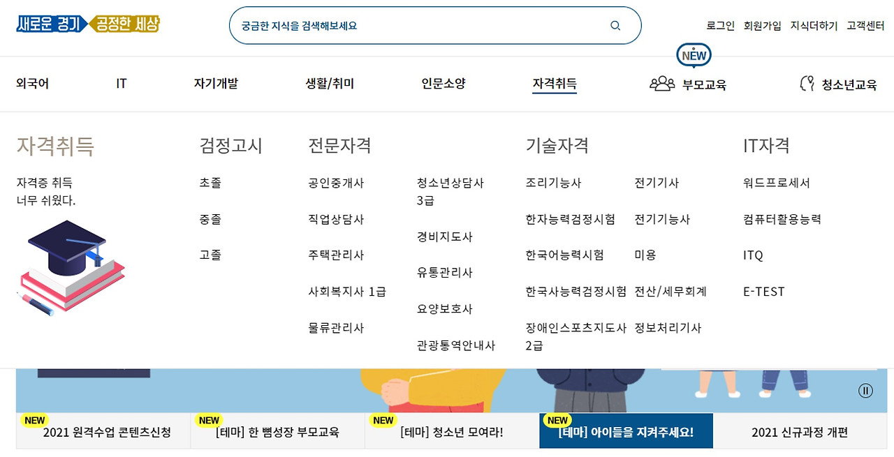 뿐만 아니라, '경기도'에서는 '경기도 GSEEK (지식)' 사이트를 운영하는데, 외국어(영중일, 제3외국어)부터 자격증 공부까지(유통관리사, 전기기사, 직업상담사 등 27개 과정) 무료로 수강할 수 있어. 경기도민이 아니어도 이용할 수 있다그.