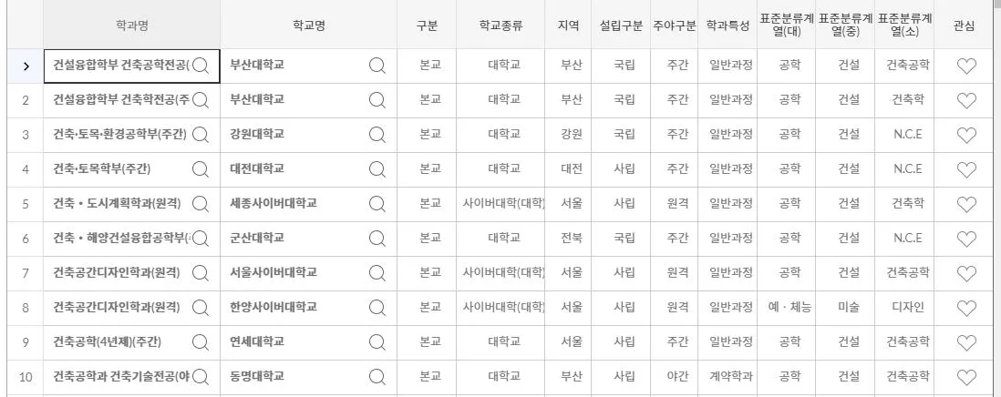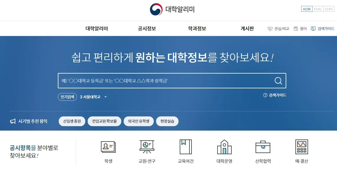 대학알리미에서는 대학과 전공 정보뿐 아니라 해당 전공의 수시/정비 비율, 중도탈락률(자퇴), 실무형 교육과정 개설현황, 등록금 정보도 볼 수 있으니 참고하기 바라.