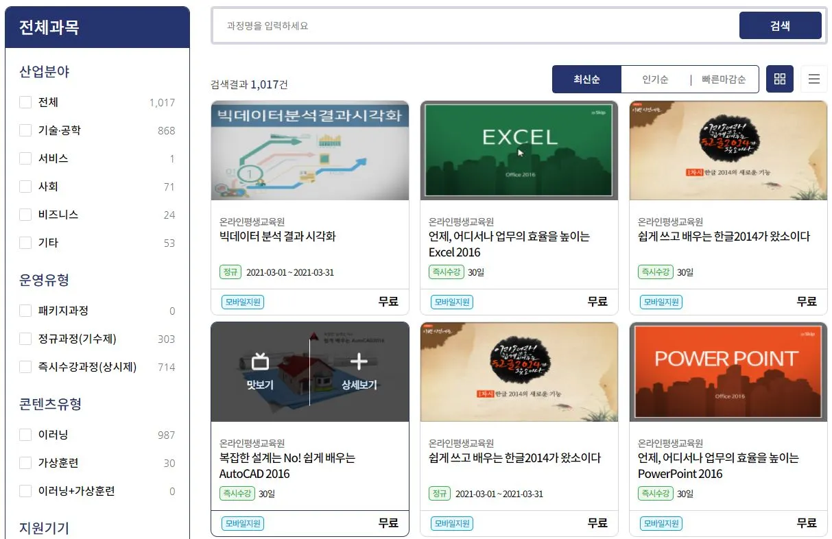 아래의 사이트는 '한국기술교육대학교'에서 지원하는 '이코리아텍'온라인 교육사이트야. 기술공학(IT, 빅데이터), 사회, 비즈니스 등 1017개의 강의를 무료로 들을 수 있어. 정규과정과 즉시 수강 과정으로 나눠지는데, 정규과정을 들어야 수료증이 나오니까 참고해.