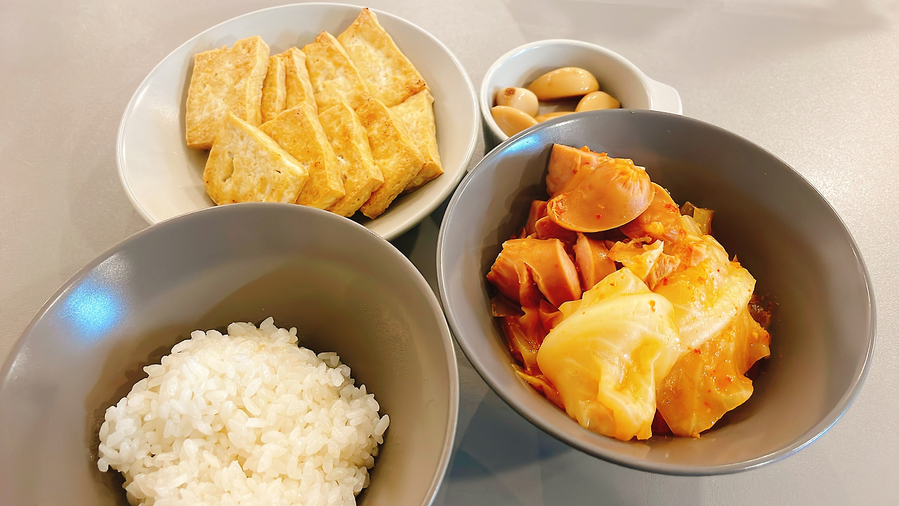 두번째 끼니는 남편이 해놓고 나간 '양배추부대찌개'와 올리브유에 구운 '두부 한 모'