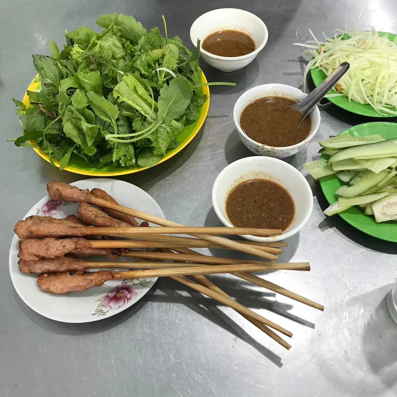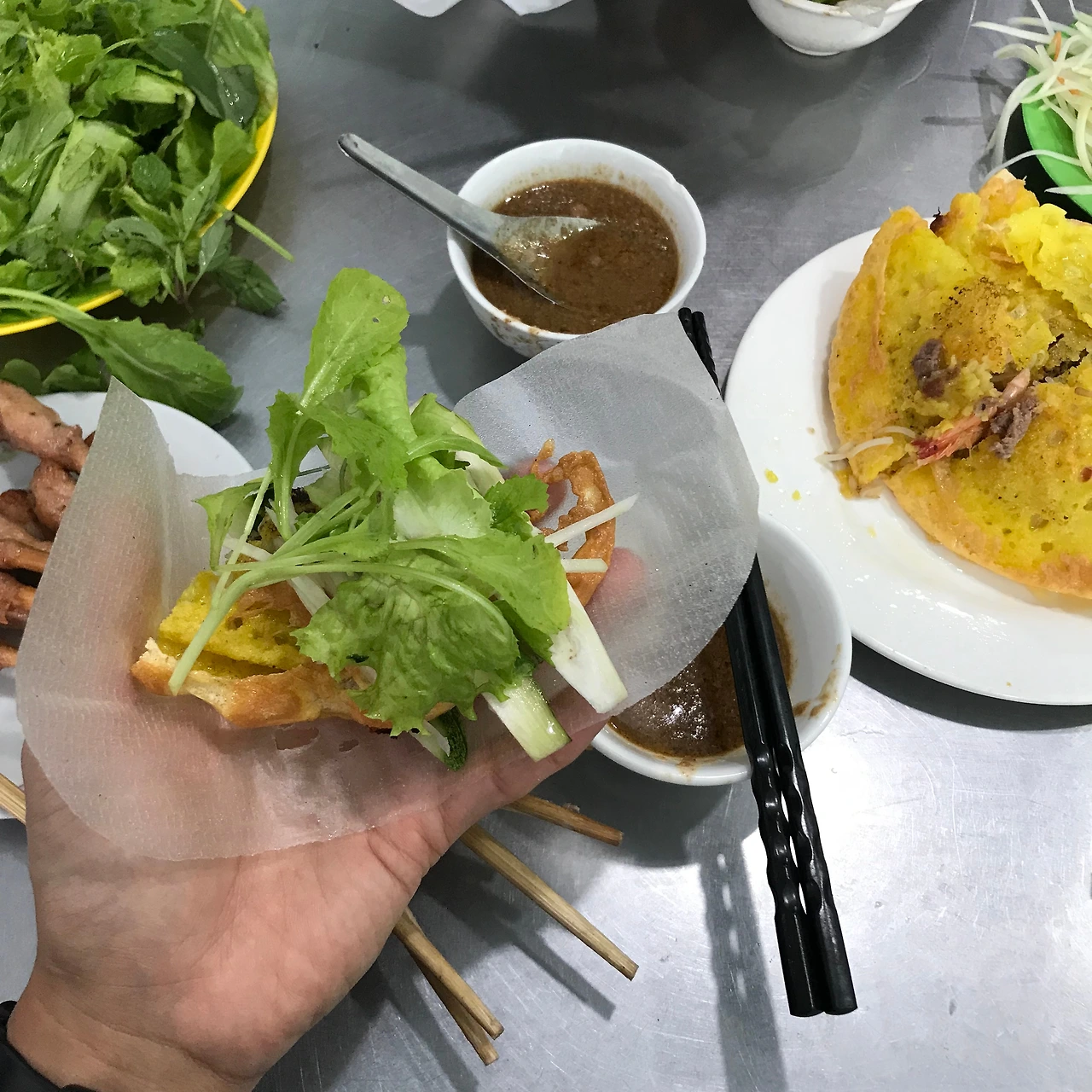 일단 우리는 너무 배고파서 늦은 점심으로 Bánh Xèo Bà Dưỡng 에 가서 반세오를 먹었는데 (아래 사진에 보이는 골목 제일 안쪽으로 들어가면 있다) 같이 나온 꼬치도 맛있었고 재료나 모든 것으로 봐서는 간단해 보였던 반세오가 얼마나 맛있던지 손이 더러워지는지도 모르고 먹었다. 맥주 안주로 딱이다.