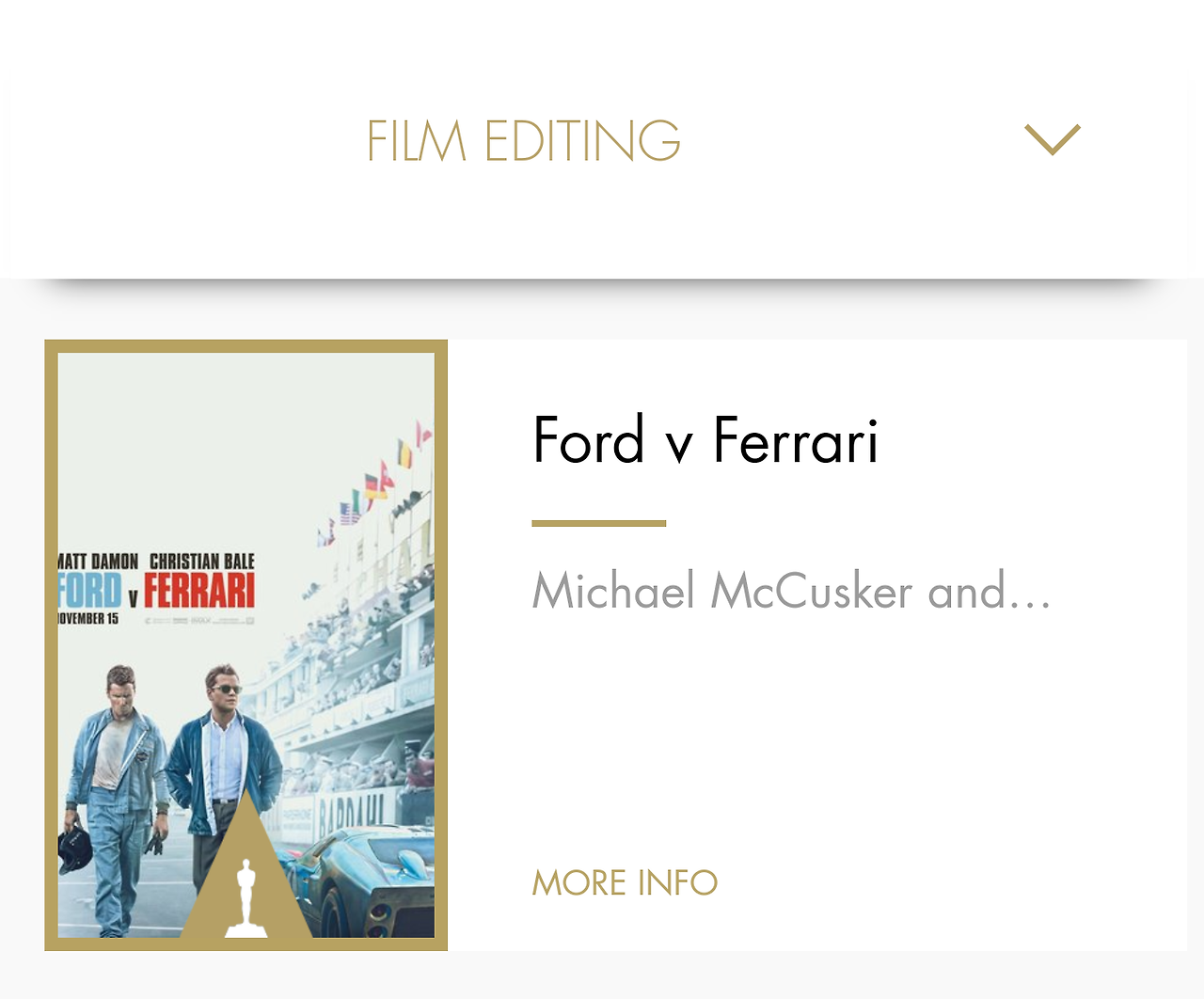 혹시 <1917>에게 돌아가면 어쩌나 싶었던 편집상은 예상했던 대로 <포드v페라리>가 수상했고, 추가로 음향 편집상까지 받게 됐습니다.
