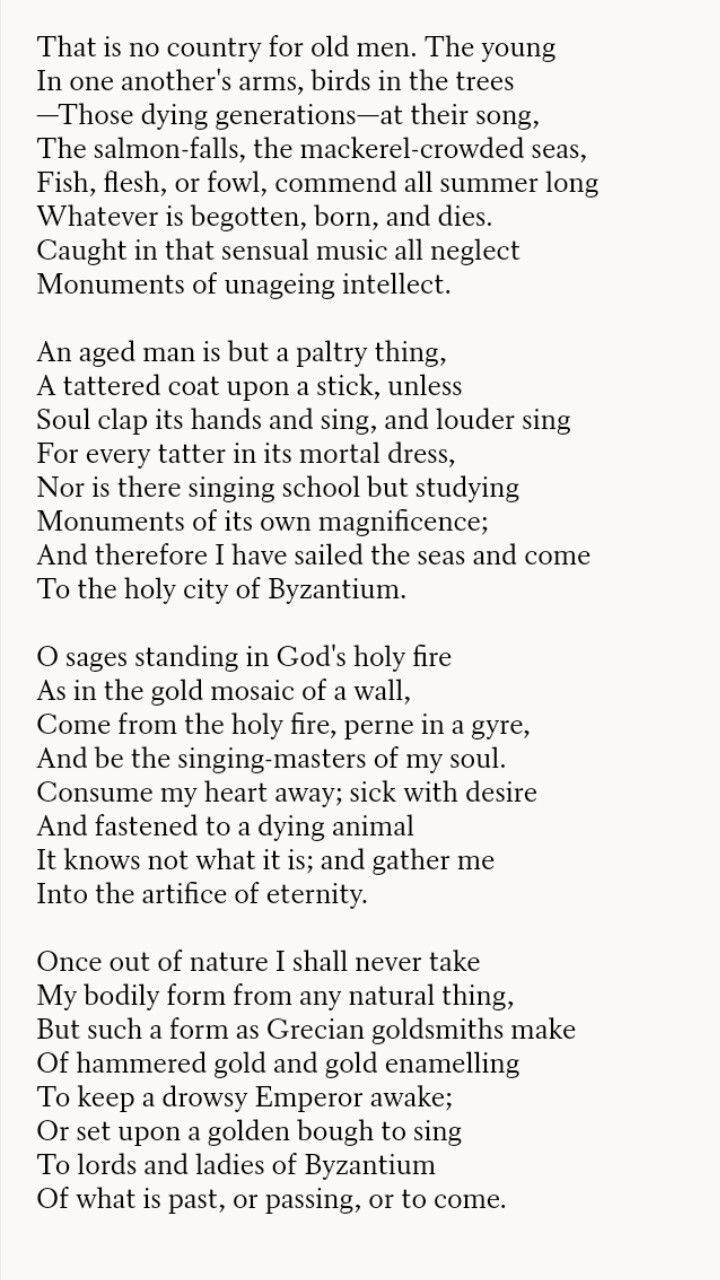 윌리엄 예이츠 또한 '이 혼란하고 험난한, 아는 것 없이 육체적이며 금전적인 탐욕만을 추구하는 젊은이들이 판을 치는 세상은, 더 이상 노인을 위한 나라가 아니다'라는 의미를 가리키고 있습니다.