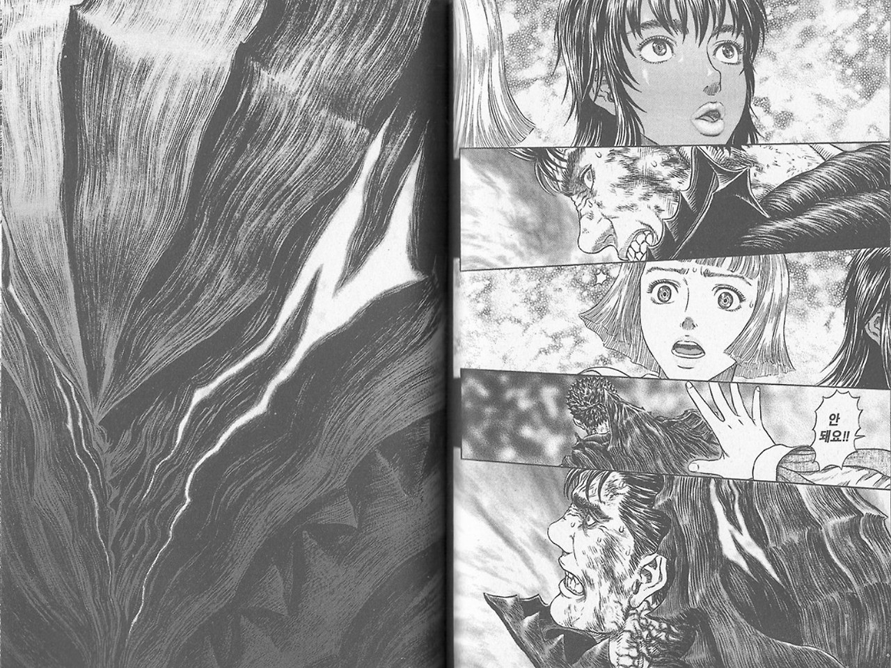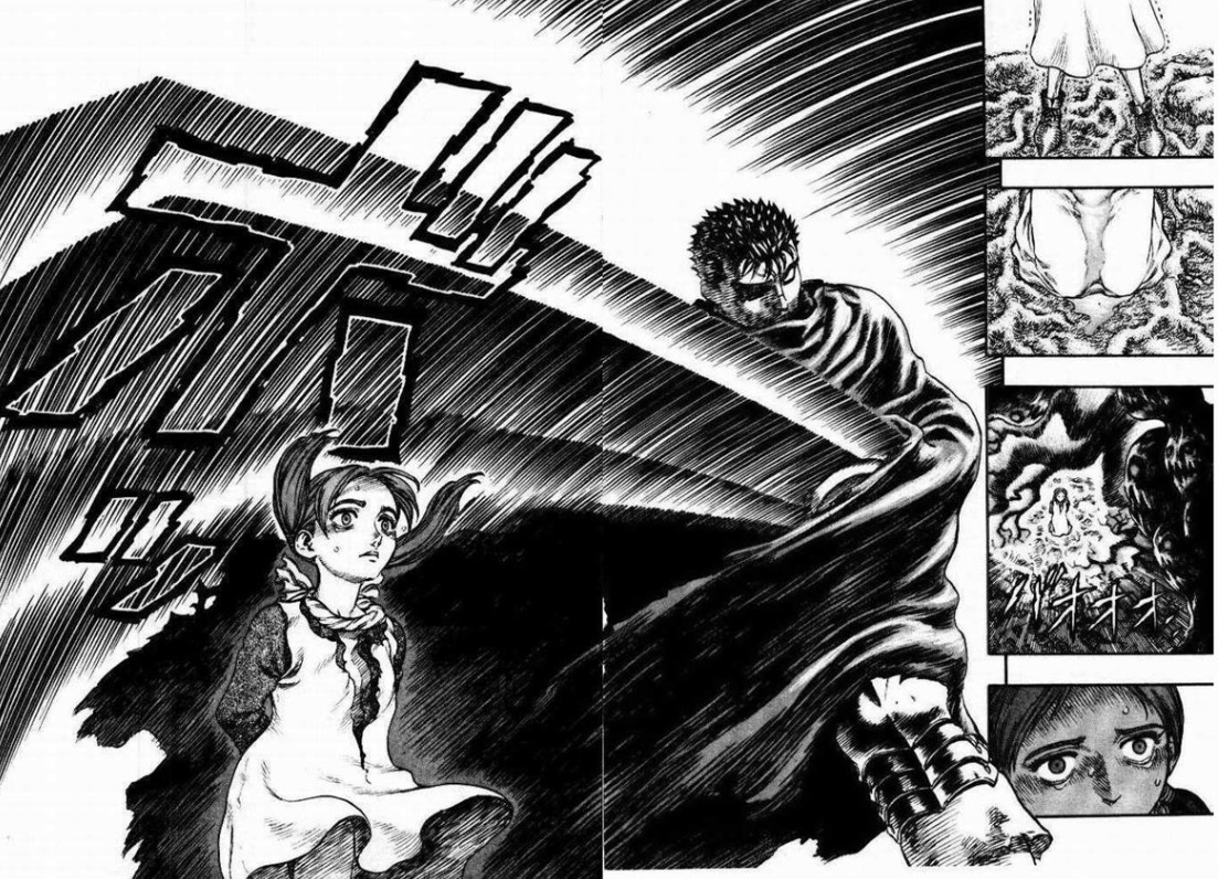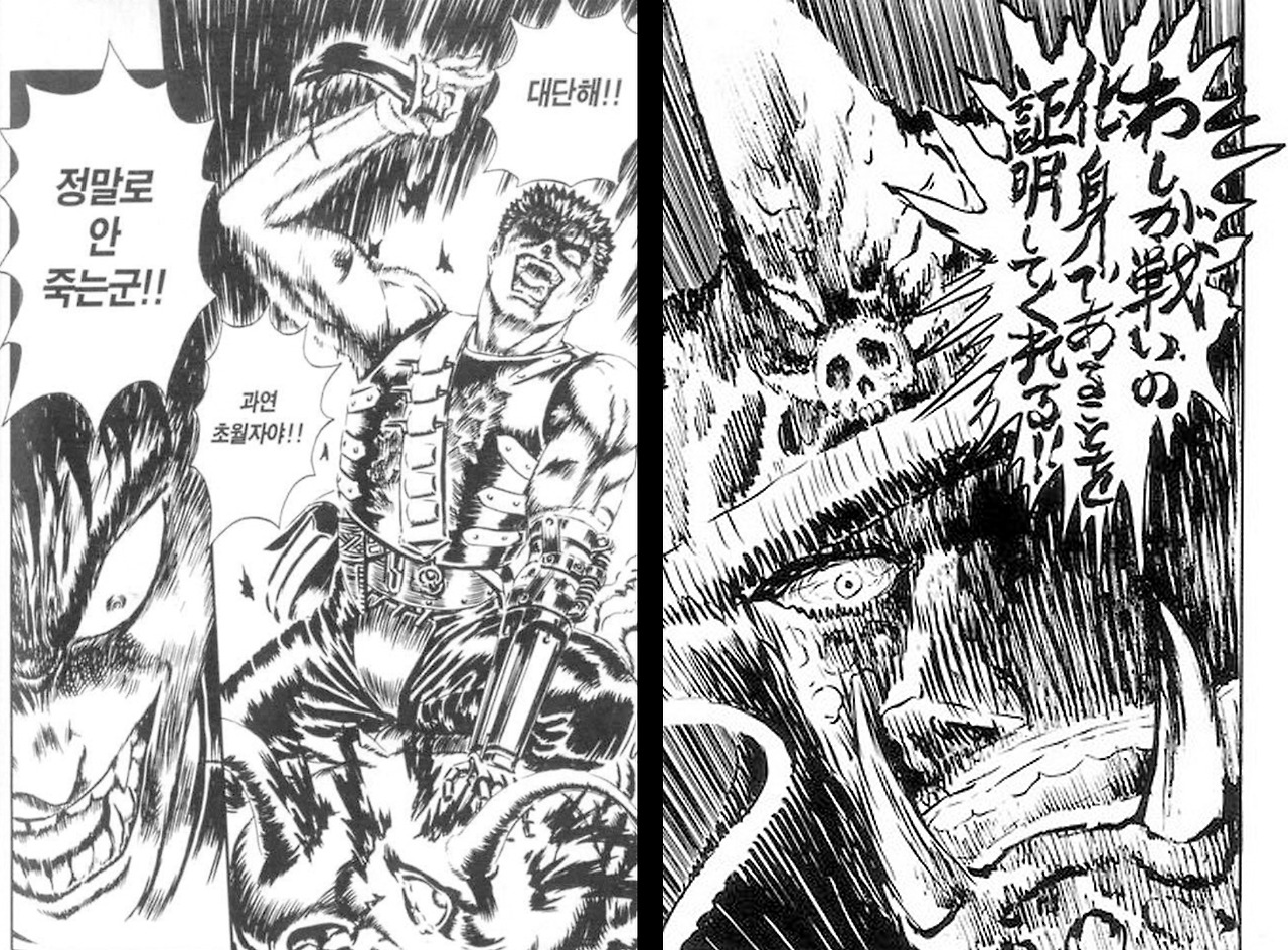 그럼에도 불구하고 <베르세르크>가 전 세계사람들에게 사랑받을 수 있던 이유는, 그 잔혹함에 대한 이유가 작품 내에 반영이 되었기 때문이다. 가츠라는 주인공이 가지는 현실의 참담함, 잔혹함, 전쟁으로 얼룩진 역사와 현실 등이 그 세심한 작화로 그려진 폭력이 고스란히 떨림으로 다가온다. 선한 것, 착한 것은 보이지 않게 상상하도록 하면 더욱 신비한 것이 되지만, 악한 것, 나쁜 것은 더 정확하고 세세하게 그려야 잘 느껴진다. 공포만화들의 작화가 훨씬 섬세하게 선이 많이 들어간 것처럼.
