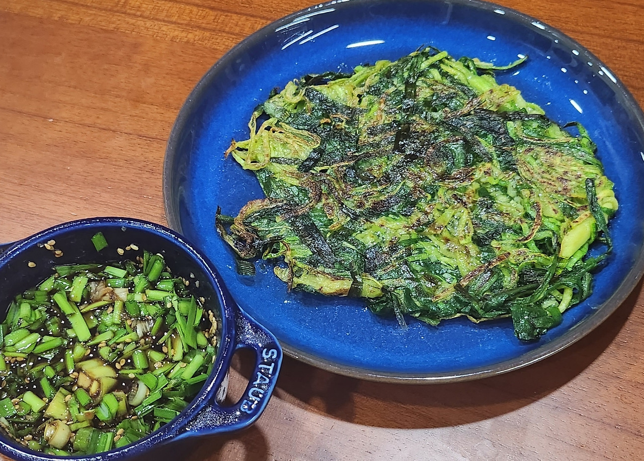 부추와 애호박이 어떻게 서로를 잘 붙잡고 있는지 뒤집을 때 타이밍을 잘못 잡으면 후드득 떨어져 속상하게 하는 김치전과는 달리 뒤집개로도 쉽게 모양이 헝클어지지 않고 뒤집히는 부추전은 너무 간결하고 쉽다.