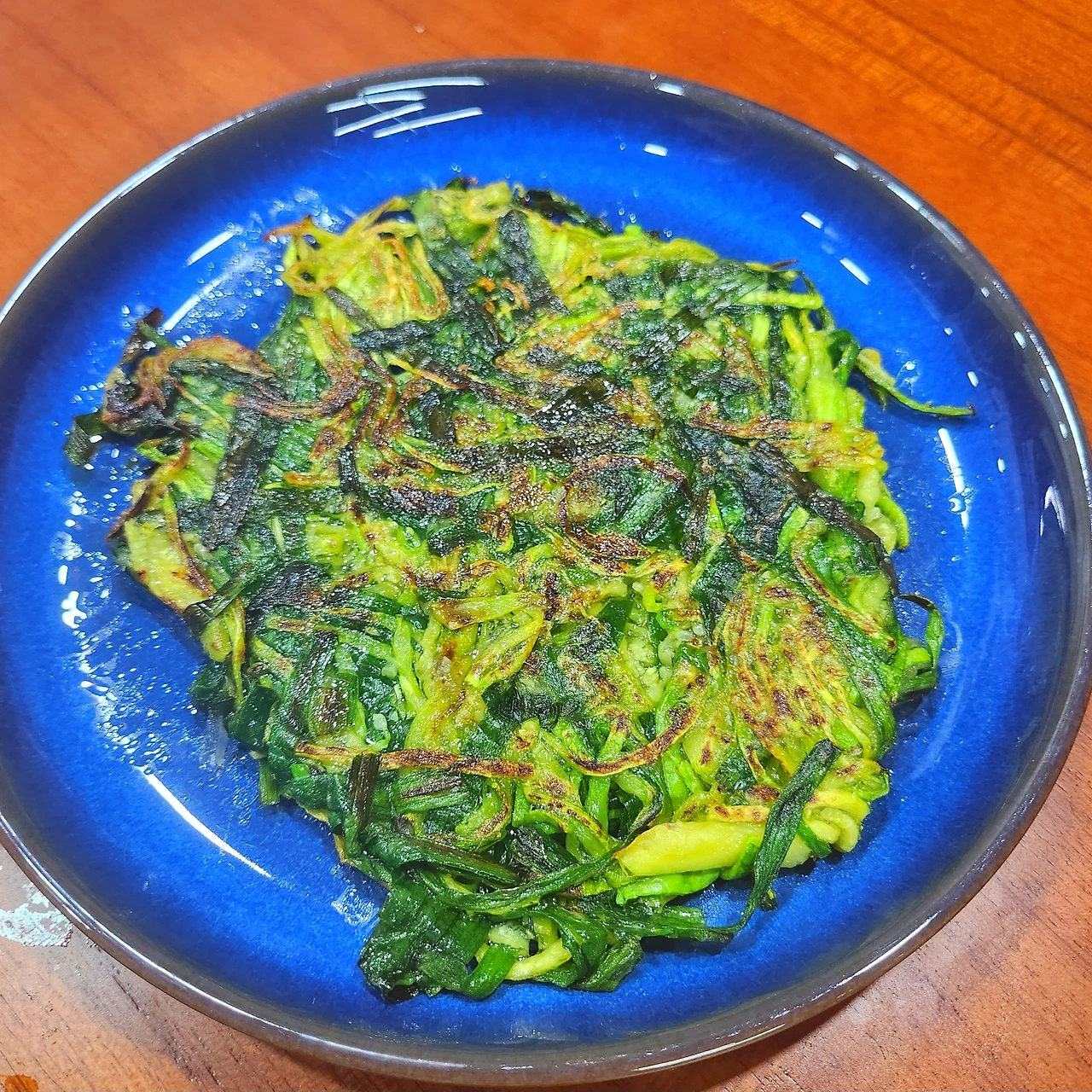 이 반죽을 달궈진 기름 팬에 무심하게 한 뭉터기로 툭 던져놓고 누르면 신기하게 전모영이 흐트러지지 않고 부추와 애호박이 잘 얽히고설켜 끈끈하게 지탱해 준다.