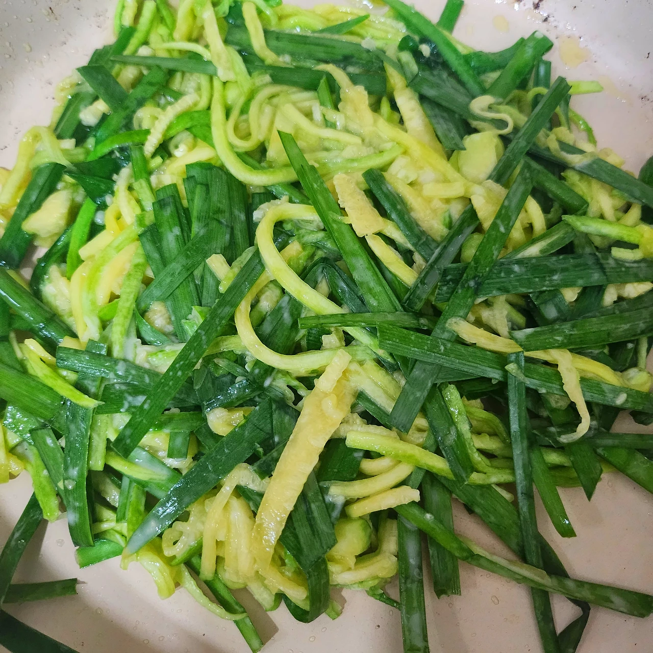부추를 잘 씻어 넣고 애호박을 채칼로 길게 길게 썰어서 같이 넣는다.