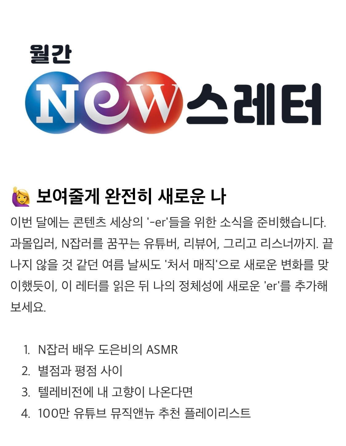 월간NEW뉴스레터를 (구독) 하시면 매월 마지막 주 콘텐츠/미디어 업계 소식을 메일로 받아보실 수 있습니다. (그간 발행된 뉴스레터를 확인해 보실 수 있는 (링크)도 공유드립니다!)