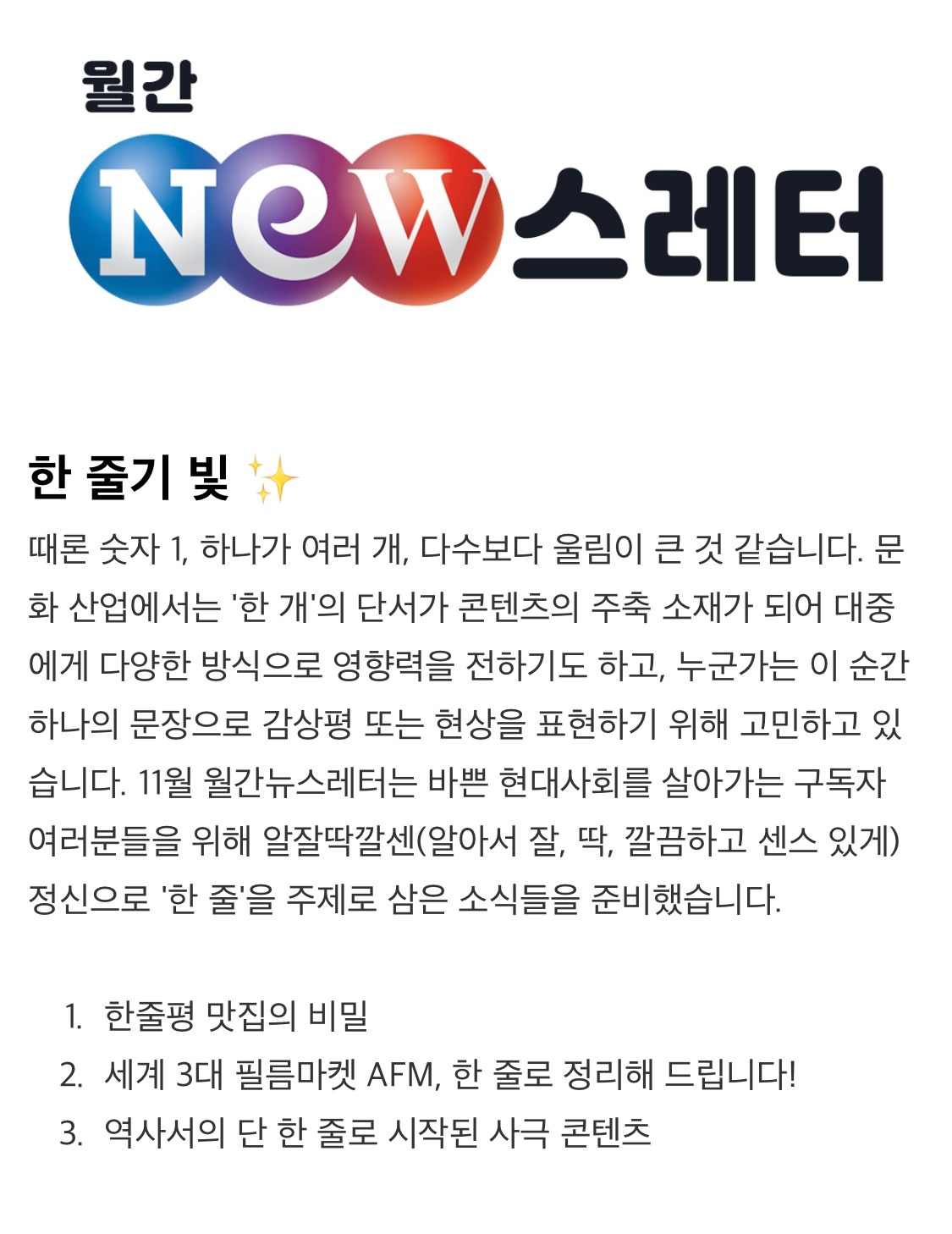 월간NEW스레터는 매달 마지막 주 콘텐츠/미디어 업계 소식을 보내드리니 관심이 있는 분들은 구독을 부탁드립니다 :)