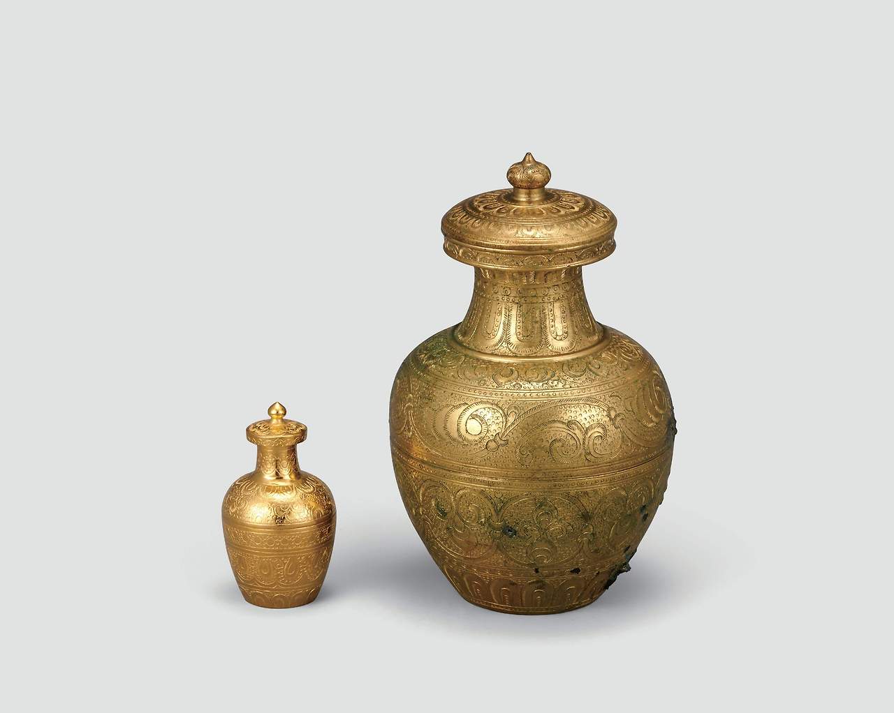 미륵사지 서쪽 석탑에서 발견된 금동사리호(오른쪽)와 금사리호(왼쪽). 국립문화재연구소 제공
