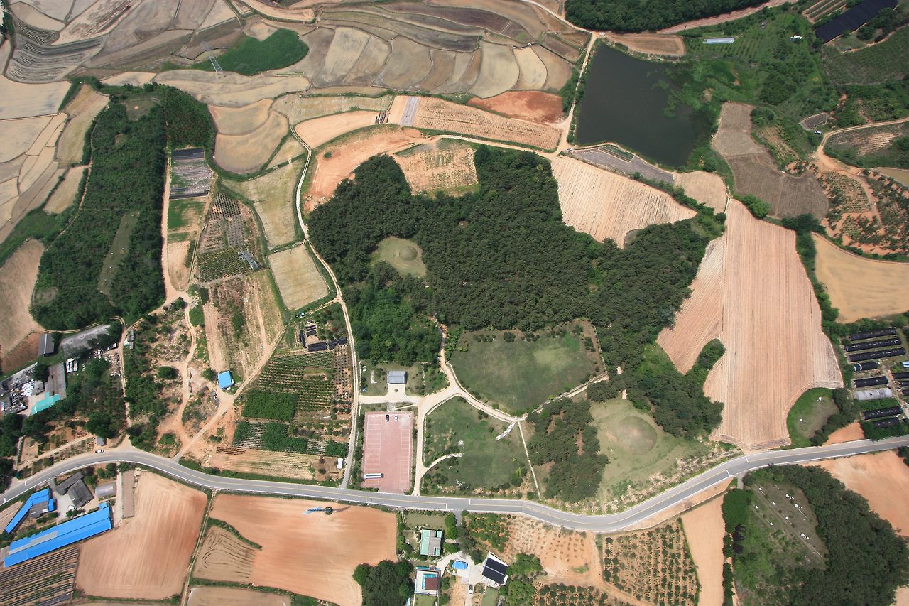 익산 쌍릉 항공사진. 위쪽의 상대적으로 작은 무덤이 왕후가 묻힌 소왕묘이고, 아래 큰 무덤은 백제 무왕이 묻힌 대왕묘로 추정된다. 원광대 마한백제문화연구소 제공